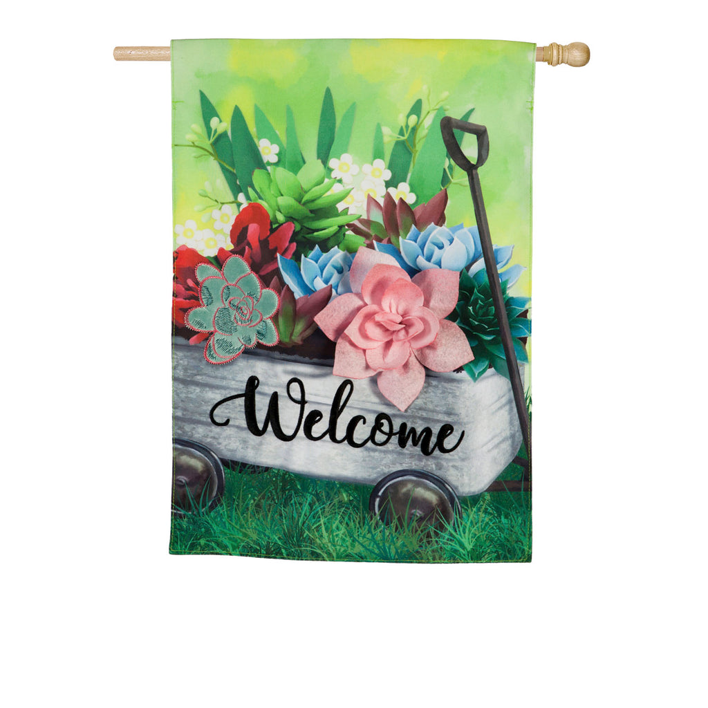 Galvanized Wagon with Succulents House Linen Flag. Evergreen Flag celebrates your unique style. Whether you are looking for the finishing touch to make your house an enjoyable home, from seasonal patio, home and garden decor, to innovative interior art, we've got you covered. Our catalog has thousands of house and garden flags, doormats, garden stakes, wind chimes, bird houses and so much more. Whether you are hosting an event or looking for a perfect gift - look no further. Evergreen Flag is the perfect "Greeting Card of Your Home." Offering you unique, value-priced options to add fun, eye-catching personality to their homes has been our focus for decades. We started designing and producing flags over 25 years ago, and we continue to work to deliver innovative and fun designs and techniques to this collection to be enjoyed season after season, year after year. This beautiful addition to your home, garden, patio or yard is crafted from weather resistant, fade resistant premium materials. It is designed to last for many seasons to come.