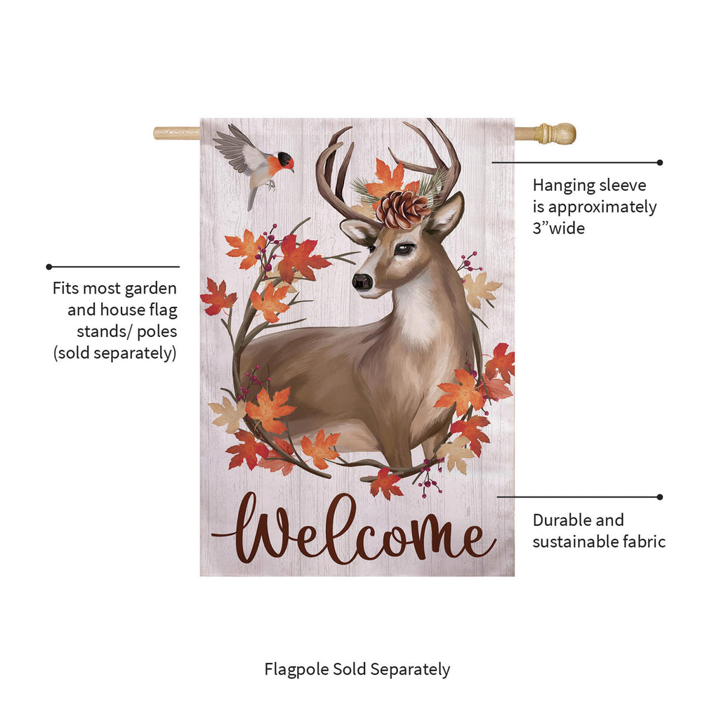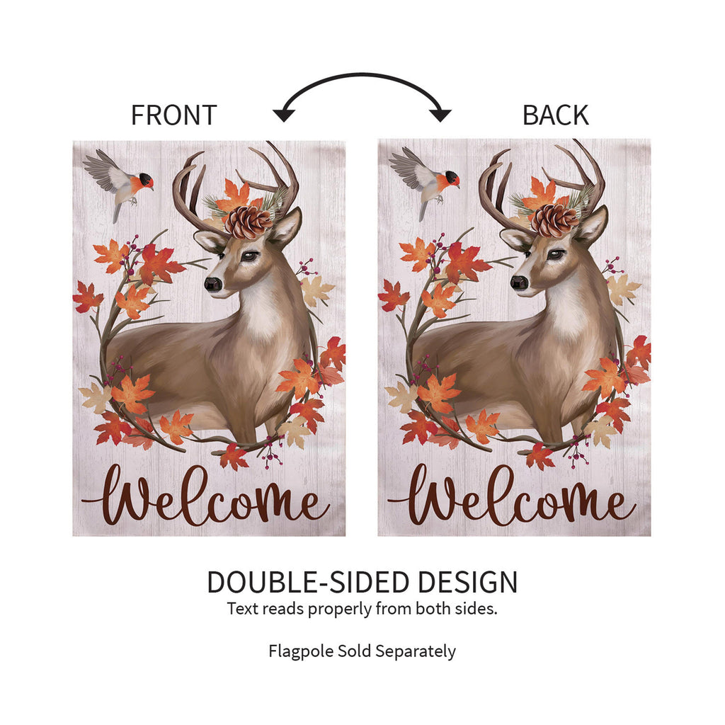 Celebrate the Thanksgiving season with this Autumn Deer Wreath Moire House Flag featuring a majestic deer surrounded by vibrant autumn leaves and a welcoming message.