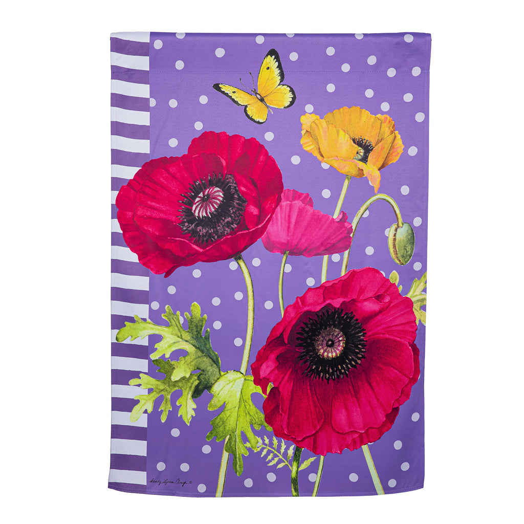 Welcome spring with this vibrant Poppy Welcome Suede House Flag, featuring colorful poppies and a butterfly on a soft suede background.