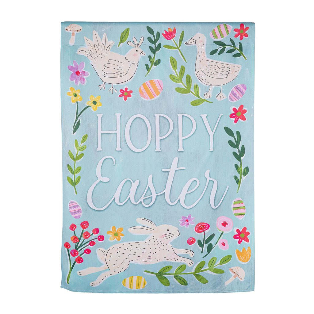 Celebrate Easter with the vibrant 'In Bloom Suede House Flag'. This charming flag features playful springtime illustrations and a joyful Easter message, perfect for adding a festive touch to your home.