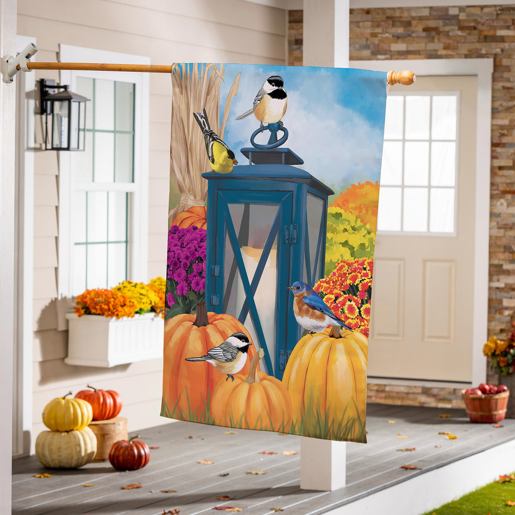 Celebrate the Thanksgiving season with this Harvest Lantern Suede House Flag, featuring vibrant fall elements and charming birds, perfect for enhancing your outdoor decor.