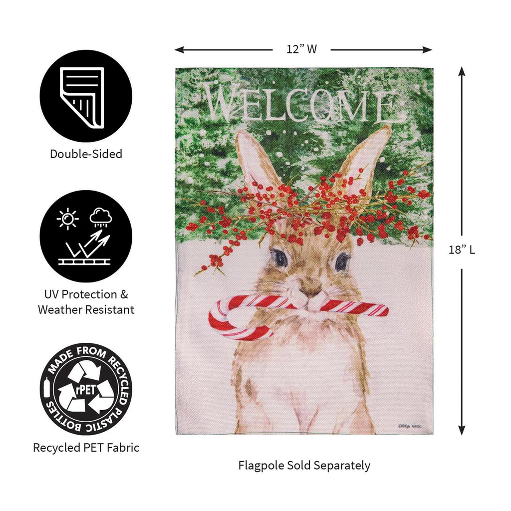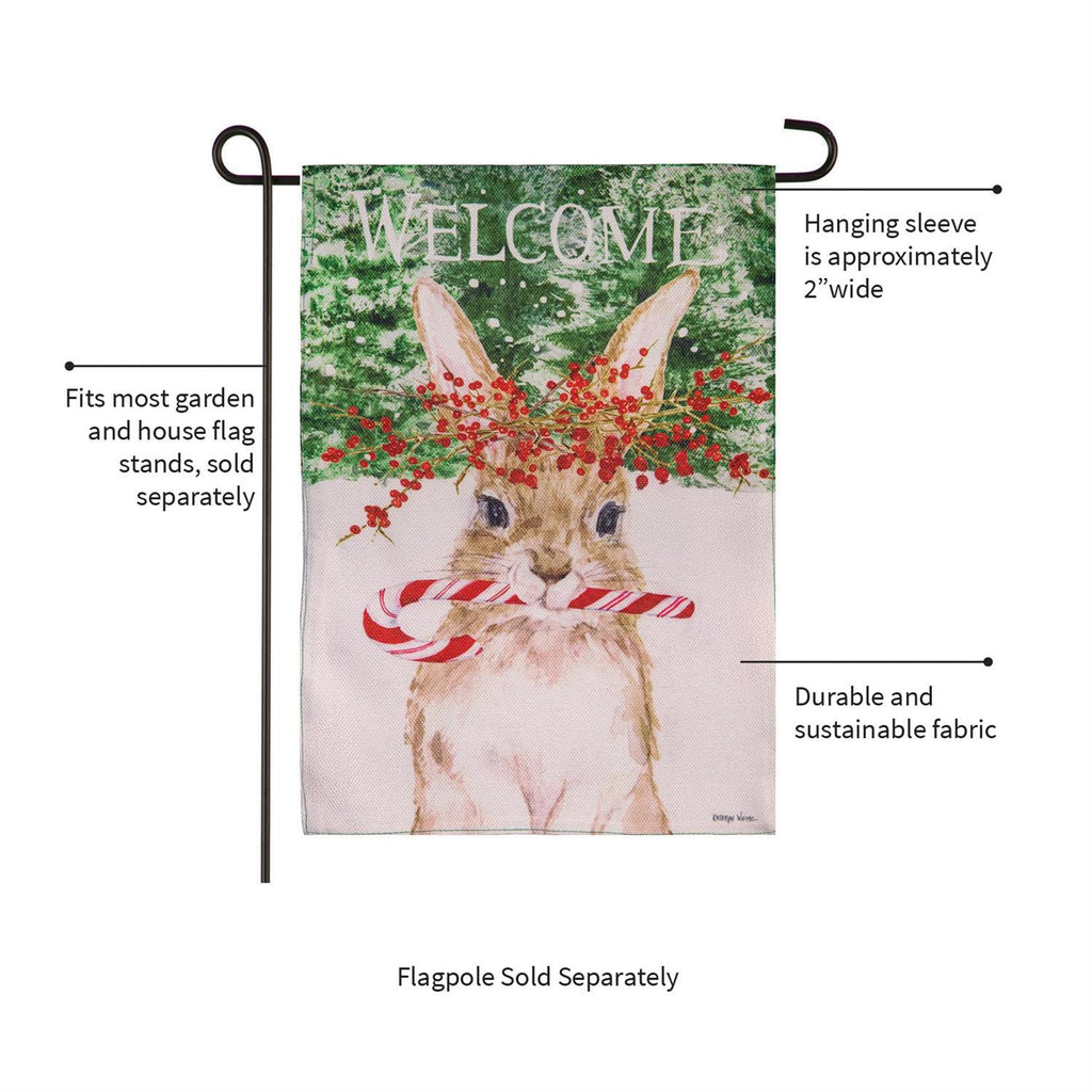 Welcome the holiday season with this charming Candy Cane Rabbit Burlap Garden Flag. Measuring 12.5 inches by 18 inches, this flag features a delightful rabbit holding a candy cane, surrounded by festive winter greenery and berries. Made from durable burlap, it withstands the elements while adding a whimsical touch to your outdoor décor. Perfect for adding a seasonal charm to your garden, porch, or entryway, this flag is an inviting addition to your holiday decorations.