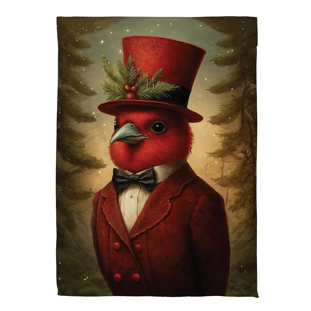 Add a touch of whimsy to your garden with the Sir Cardinal Suede Garden Flag. This charming flag features an elegantly dressed cardinal, complete with a festive top hat and bow tie, set against a serene winter backdrop. Made from durable suede, this flag is designed to withstand the elements while maintaining its vibrant colors. Perfect for adding personality to your outdoor space during the holiday season or any time of year. Measuring 12.5 inches wide by 18 inches high, it's an ideal size for any garden or entryway.