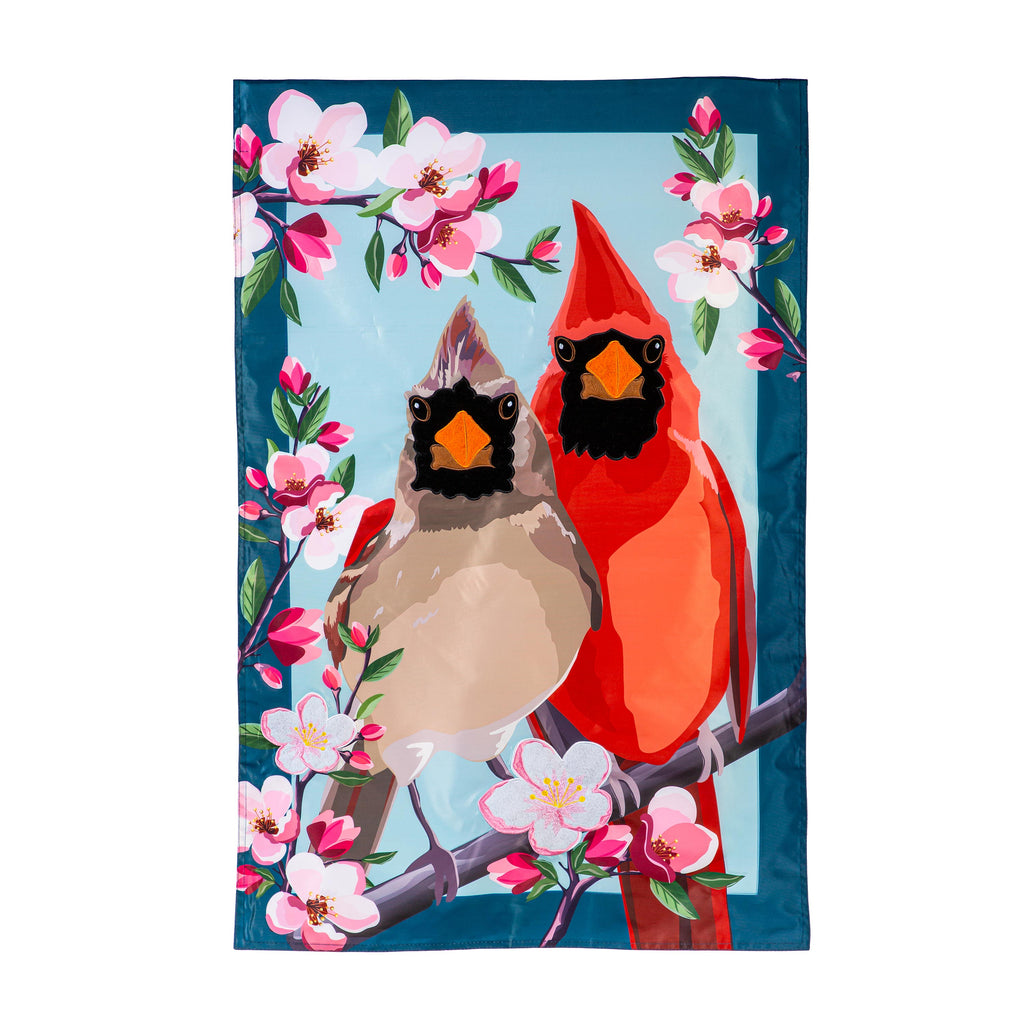Enhance your home's exterior with the Cardinal Couple Applique House Flag, featuring vibrant cardinals amidst blooming spring flowers.