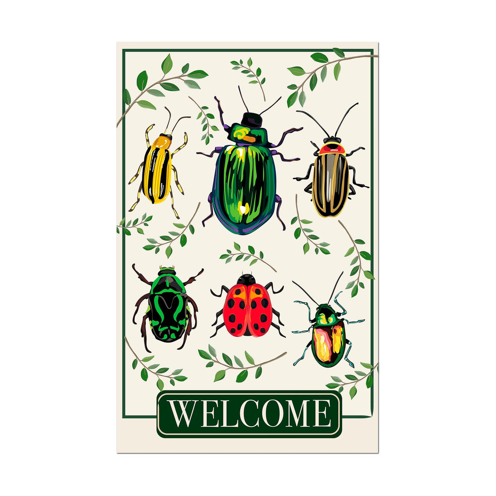 Welcome the spring season with this charming Garden Beetles Applique House Flag, featuring vibrant beetle designs and a welcoming message.