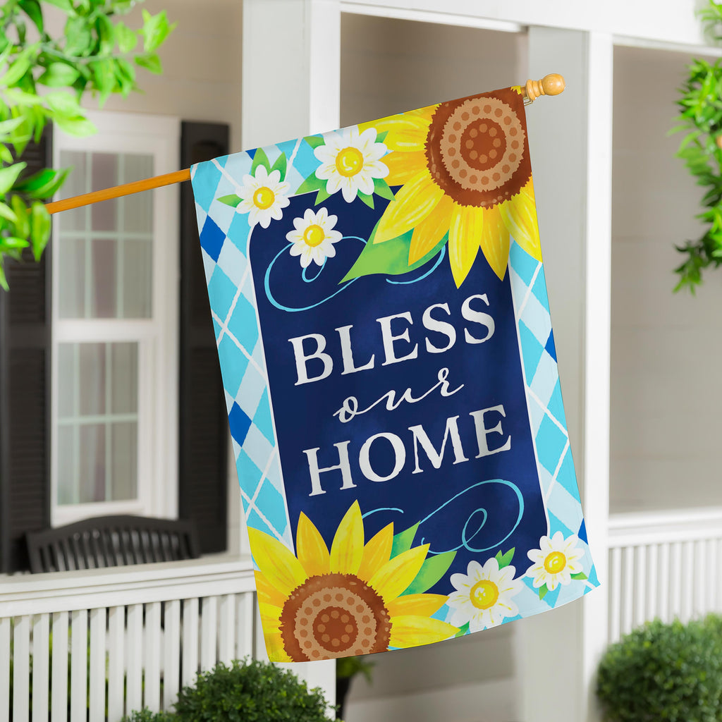 The Bless Our Home Sunflowers Applique House Flag adds a welcoming touch to any home with its vibrant sunflower design and heartwarming message.