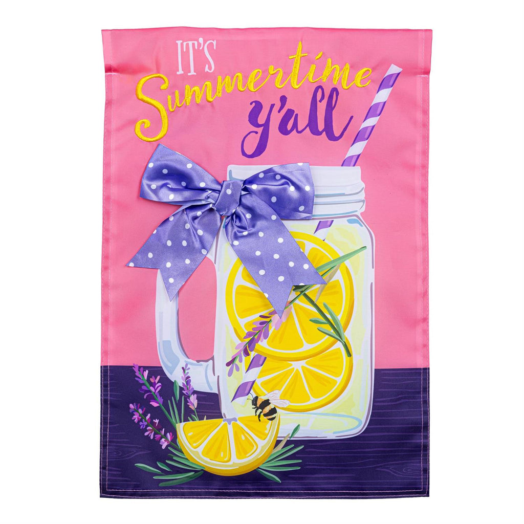 Welcome the warm, sunny days with the Lavender Lemonade Applique Garden Flag, a delightful addition to your outdoor décor. Featuring a vibrant design of lemons and lavender in a mason jar, this flag brings a refreshing touch to any garden or patio. The playful text and detailed applique work create a charming summer vibe, perfect for celebrating the season. Measuring 18 x 12.5 inches, this durable flag is crafted for outdoor use, ensuring it stays bright and inviting throughout the summer months. Easily hang it up to add a splash of color and cheer to your outdoor space.