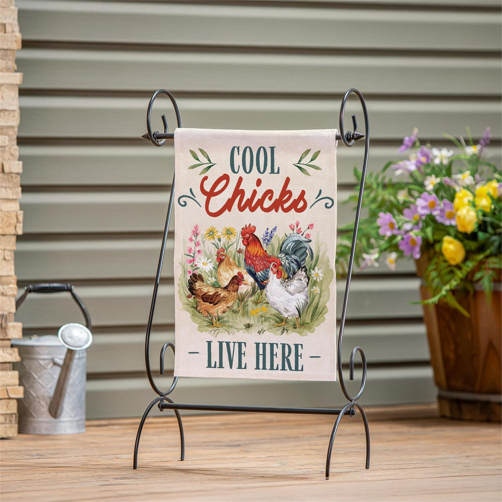 Add a touch of whimsy to your garden with the Petal & Plow Cool Chicks Burlap Garden Flag. Measuring 18 inches by 12.5 inches, this charming flag features vibrant illustrations of chickens surrounded by florals, making it a perfect seasonal decoration. Made from durable burlap, it provides a rustic touch while withstanding the elements. The playful design and message make it an ideal accessory for welcoming guests or enhancing your outdoor space. Easy to display, it fits standard garden flag poles, adding a fun, farmhouse vibe to your garden or patio.