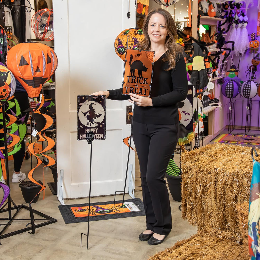 Illuminate your garden this Halloween with these charming Solar Metal & Glass Halloween Garden Stakes. Each stake stands at an impressive 36 inches tall, featuring vibrant designs of witches, black cats, and bats that capture the spooky spirit of the season. The solar-powered design ensures that these stakes light up at night, creating an enchanting glow that is sure to delight trick-or-treaters and guests. Crafted from durable metal and glass, these stakes are built to withstand the elements, making them perfect for outdoor use. With six pieces included, you'll have plenty to transform your yard into a Halloween wonderland.