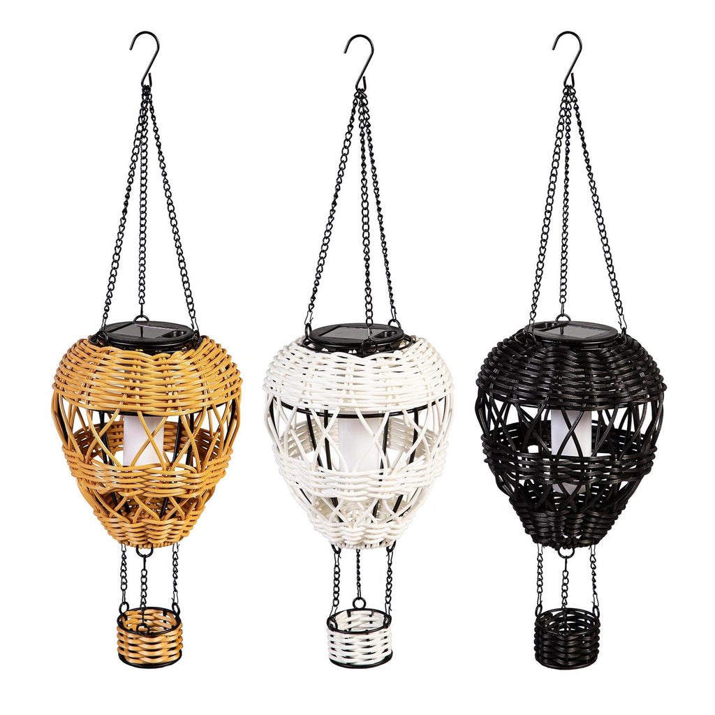 Elevate your outdoor space with the enchanting charm of the Faux Rattan Solar Hot Air Balloon Lamps. This set of three solar-powered lights is crafted from durable faux rattan, creating a whimsical hot air balloon design that adds a touch of magic to any garden or patio. Measuring 5.51 inches in length and width, and standing 18.5 inches tall, these lamps are perfect for hanging from trees or hooks, illuminating your evenings with a warm, inviting glow. The solar-powered feature ensures energy efficiency, automatically lighting up at dusk for hassle-free operation.