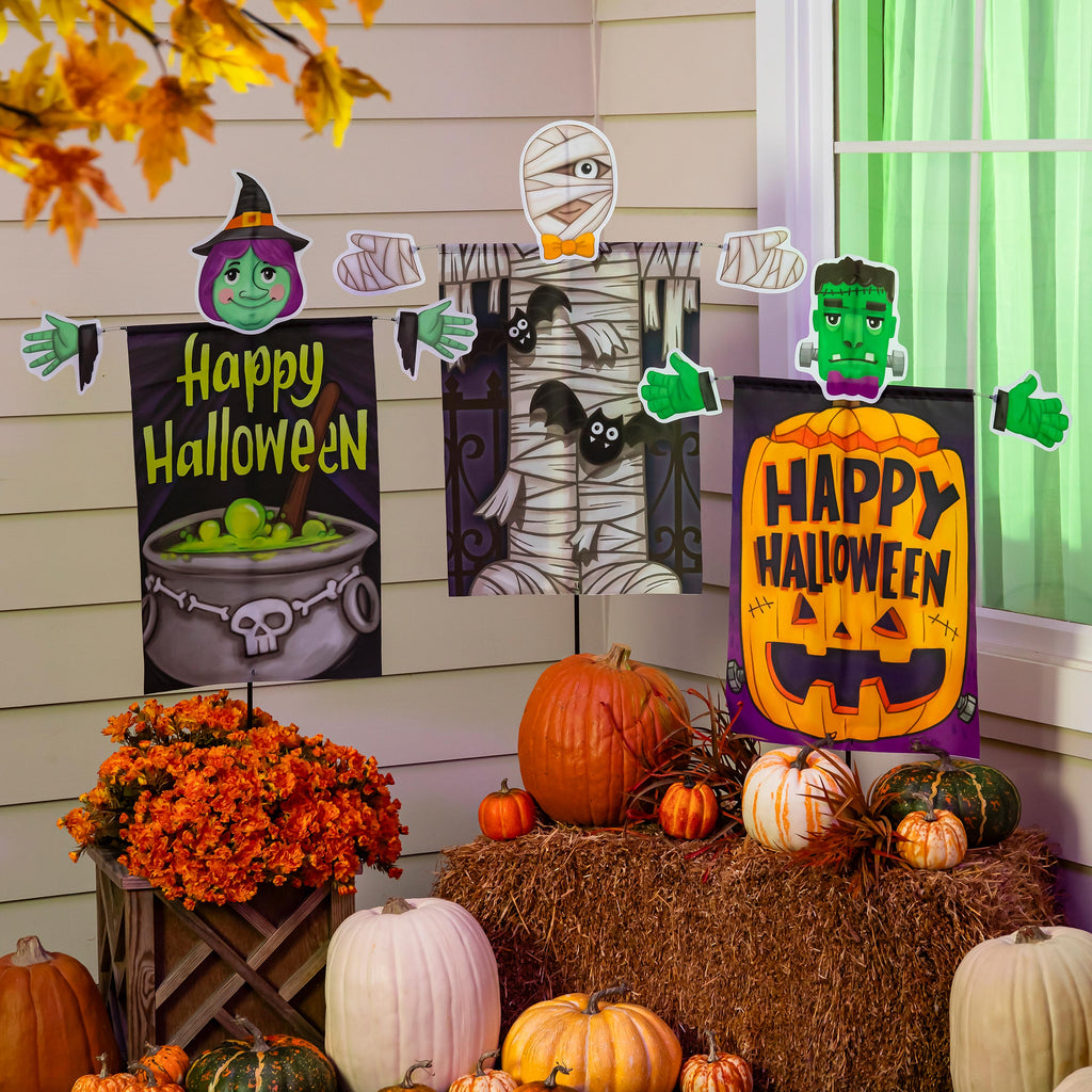 Add a festive touch to your garden with these Halloween-themed fabric stakes featuring bobbing heads and hands. Perfect for creating a spooky atmosphere, each stake showcases unique, eye-catching designs.