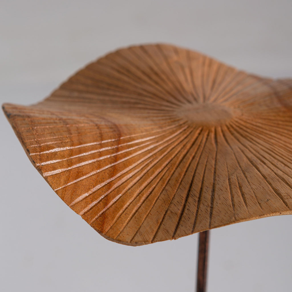 • Hand-carved wooden mushrooms add a unique, natural element to your garden.