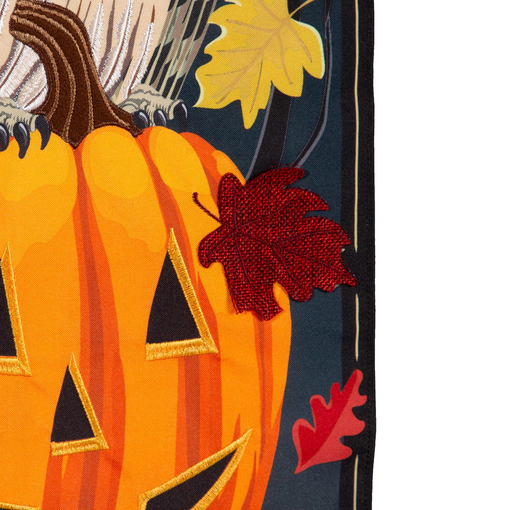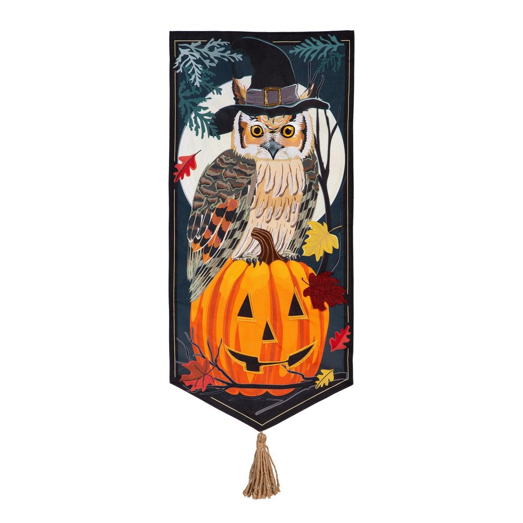 Enhance your Halloween decor with this captivating textile featuring a charming owl perched on a pumpkin. Perfect for adding a festive touch to your home.