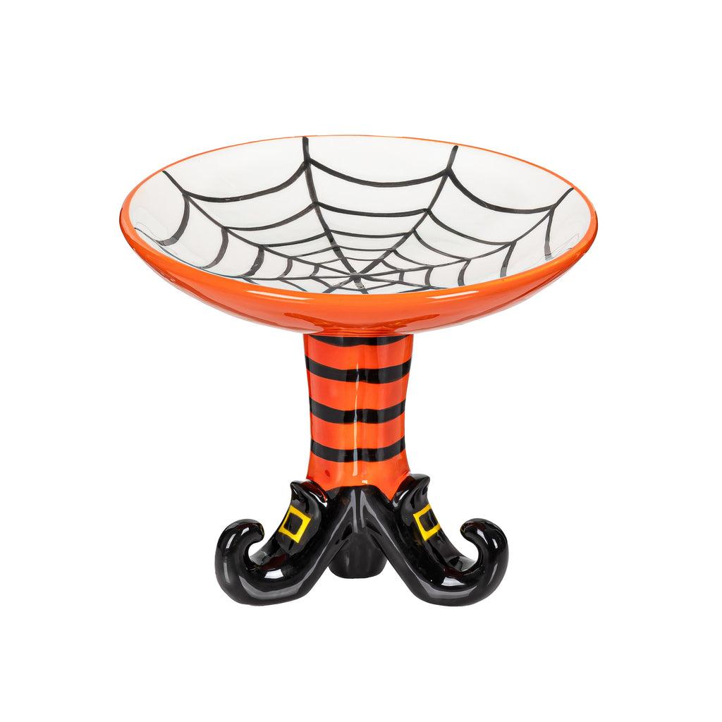Add a touch of whimsy to your Halloween gatherings with this Witch Leg Ceramic Serving Dish, featuring a playful spider web design on a vibrant orange and black base.
