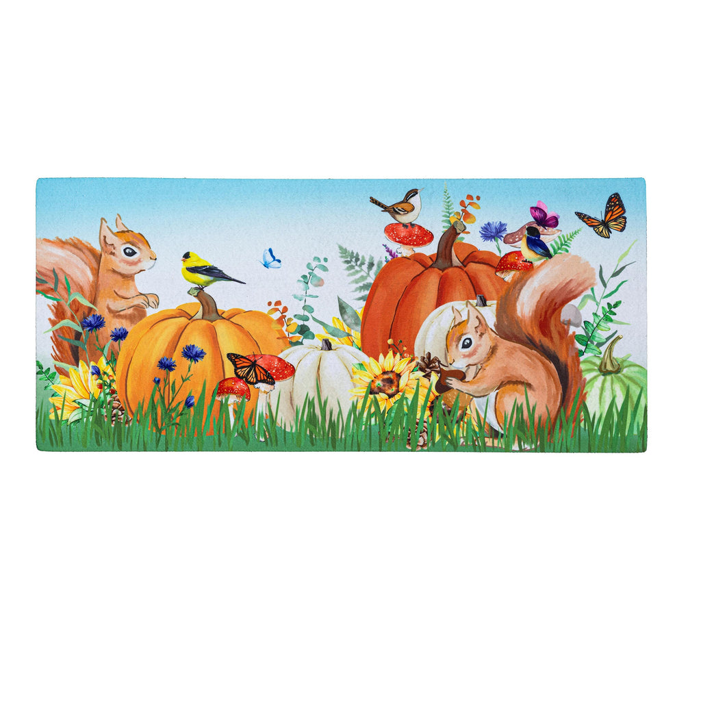Welcome the fall season with this charming Sassafras switch mat, featuring playful squirrels amidst vibrant pumpkins and autumnal flora. Perfect for adding a touch of whimsy to your outdoor entryway.