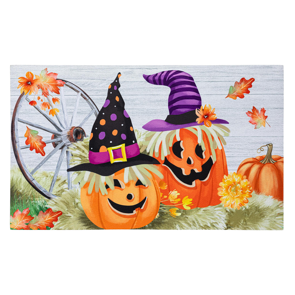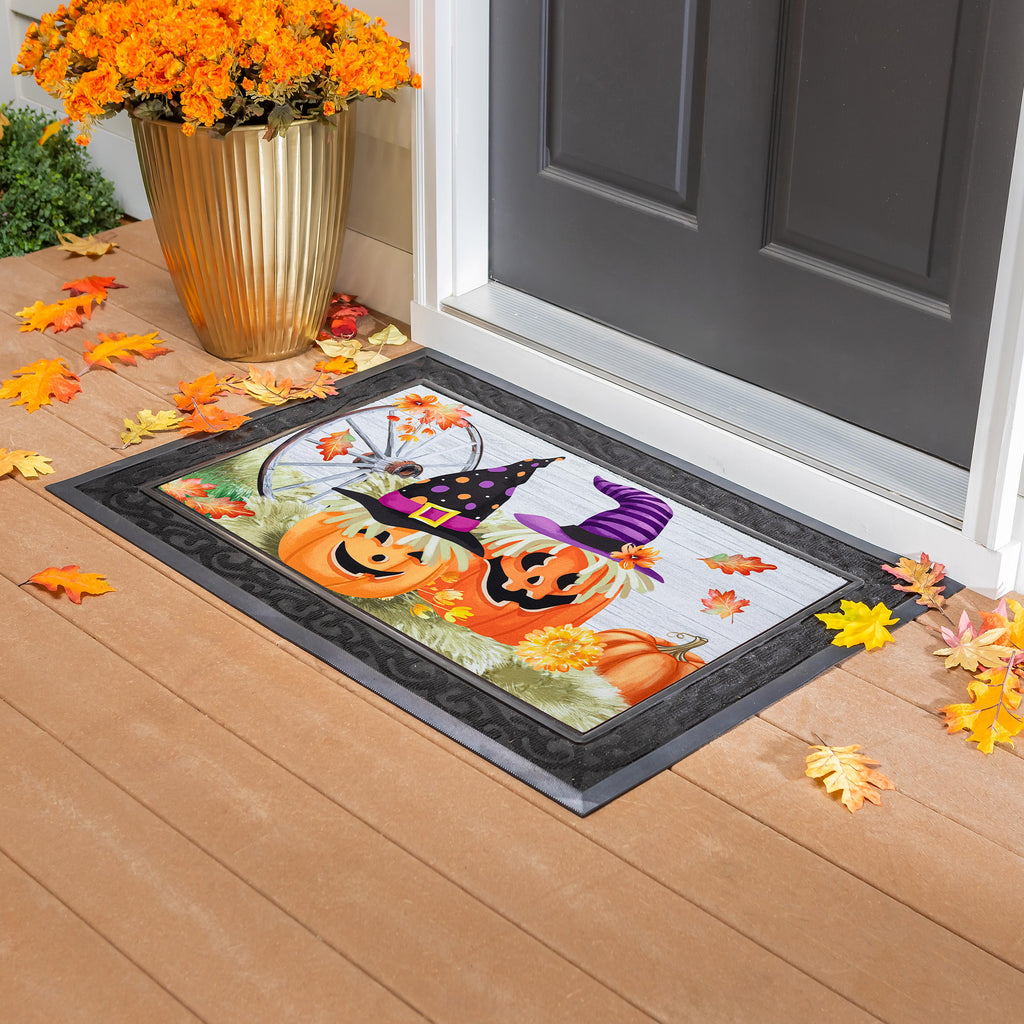 Welcome guests with a festive touch using this vibrant Halloween-themed Sassafras mat featuring cheerful jack-o'-lanterns and autumn leaves.