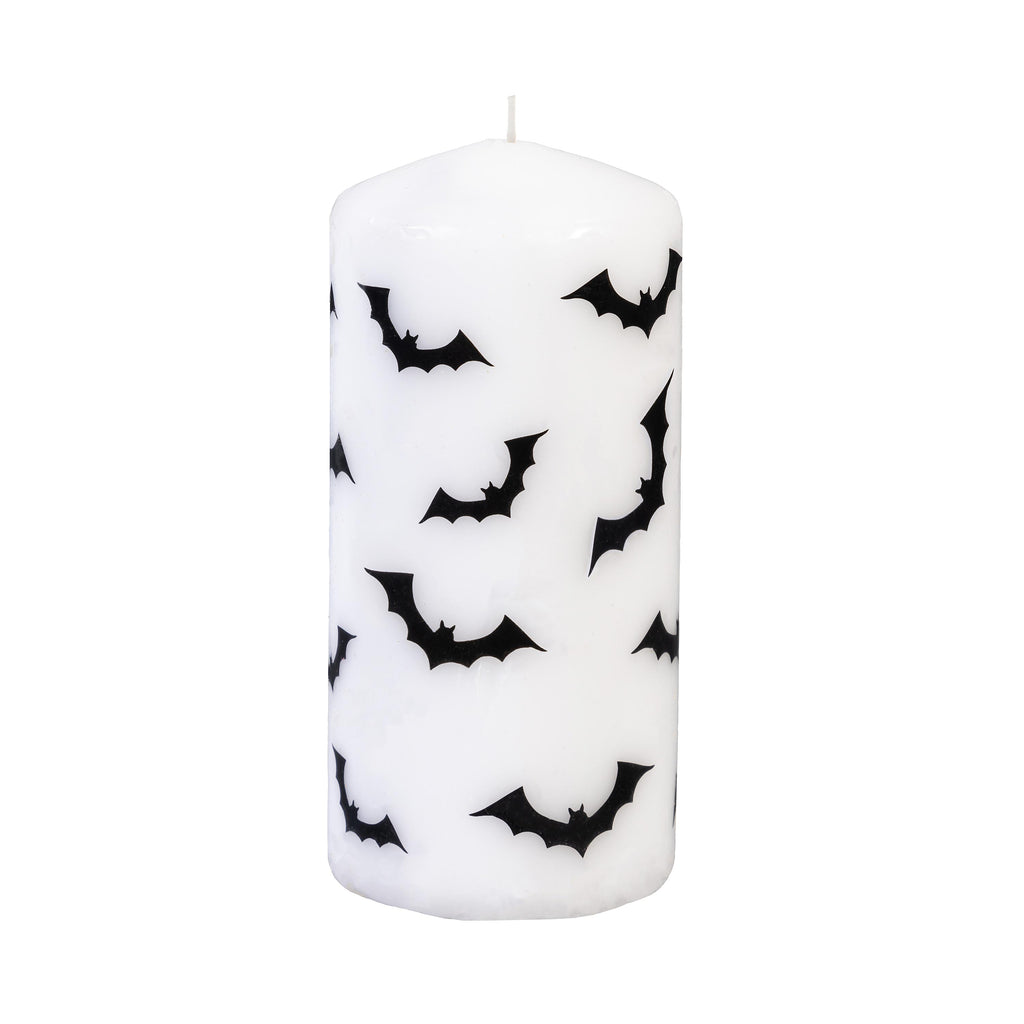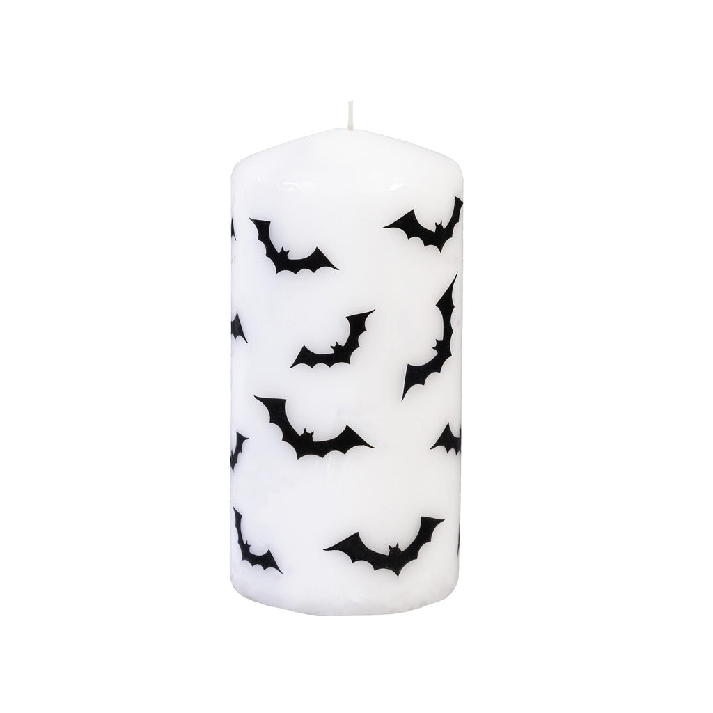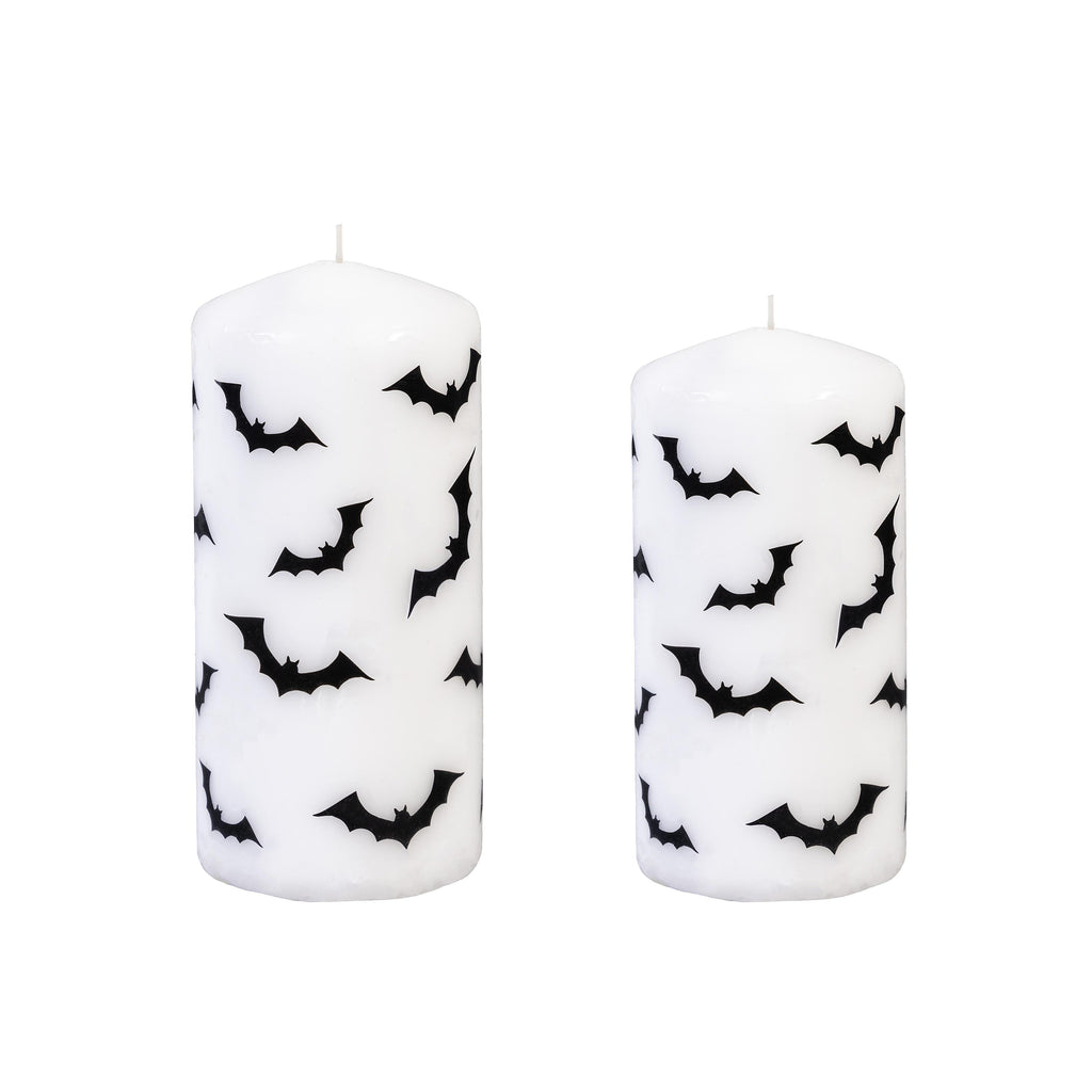 Add a touch of Halloween spirit to your home with this set of two bat-embellished pillar wax candles, perfect for seasonal decor and spooky ambiance.