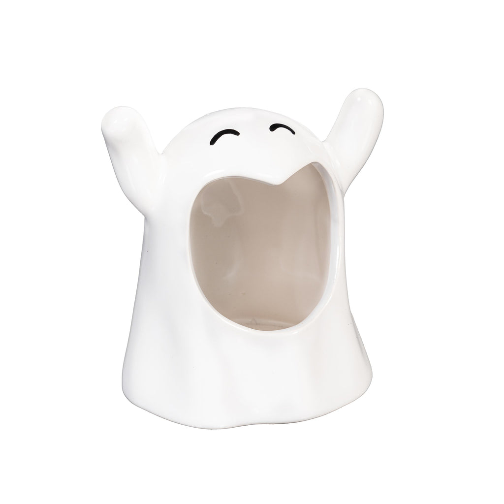 Illuminate your Halloween festivities with this charming Ceramic Happy Ghost Tealight Candle Holder, designed to infuse playful spirit into your decor.