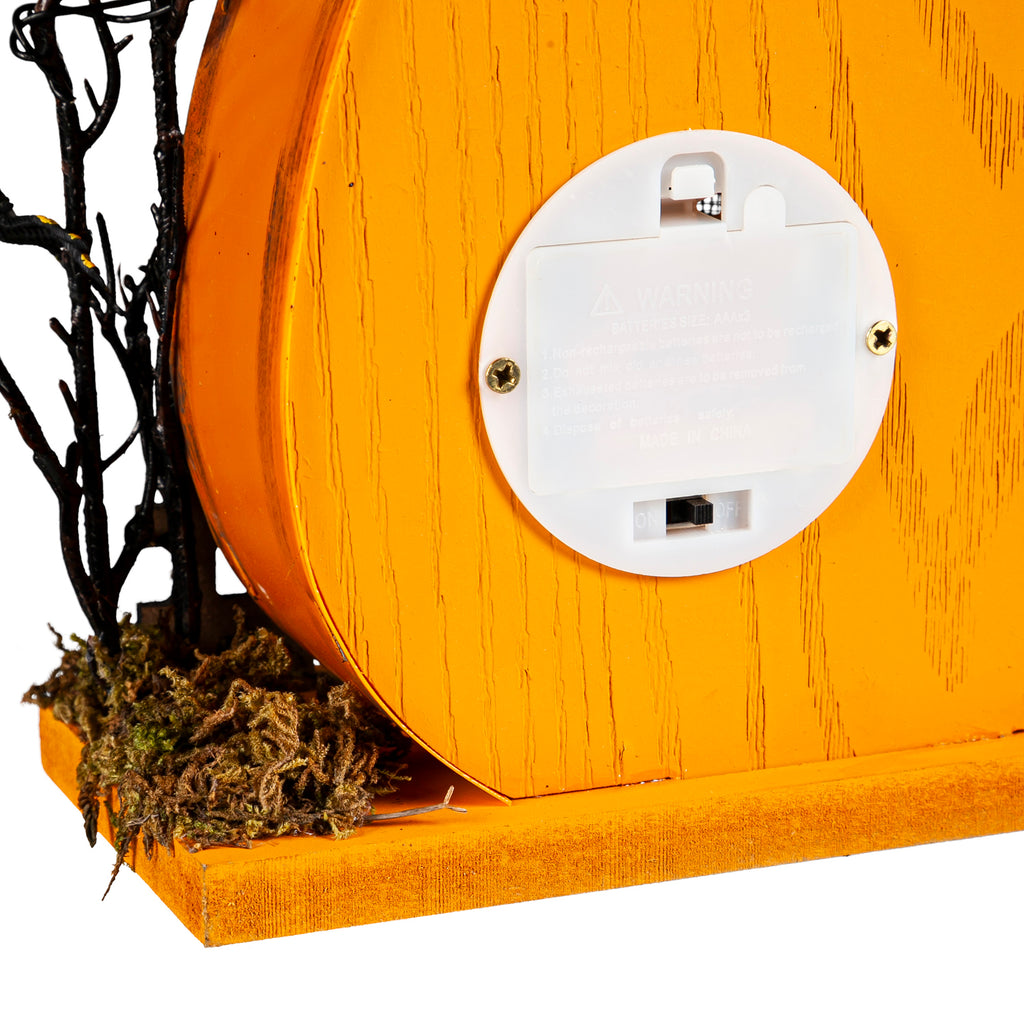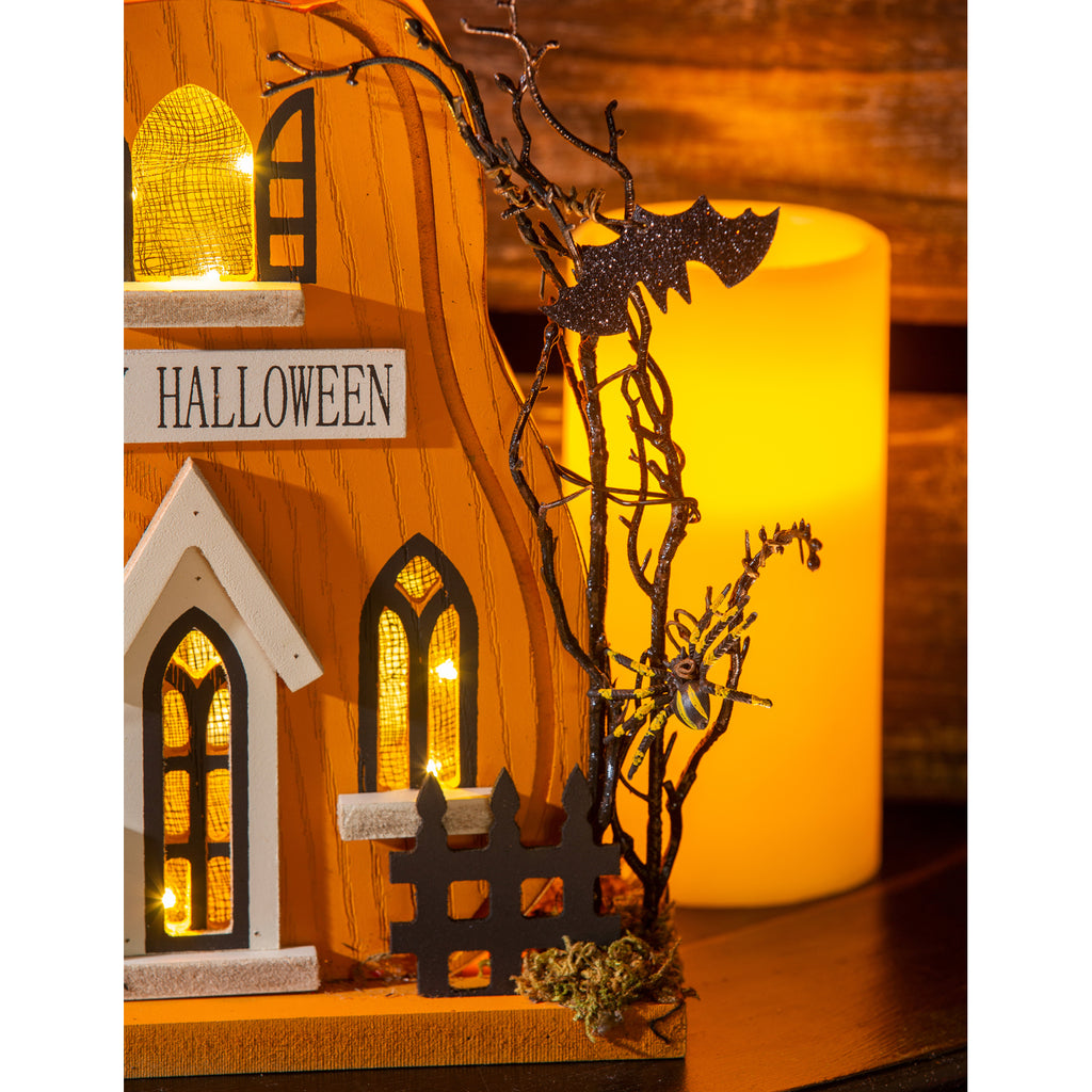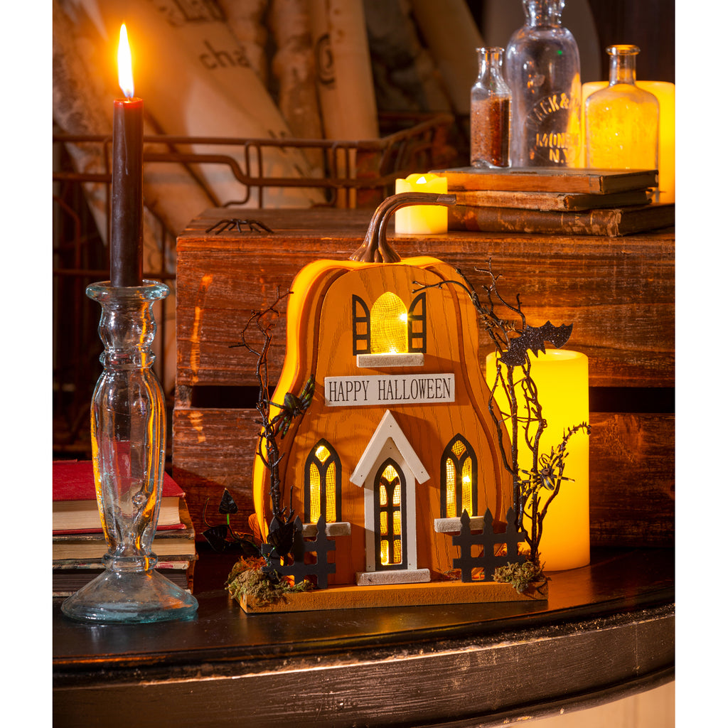 Illuminate your Halloween setup with this LED Wood 'Happy Halloween' Haunted Pumpkin House Table Decor. This charming piece brings a warm, eerie glow to any room with its intricate design.