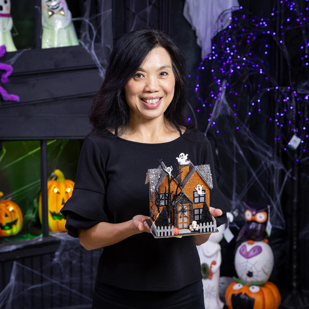 Illuminate your Halloween festivities with this Haunted House LED Table Decor. Featuring a spooky design with ghosts, spiders, and a picket fence, it's perfect for adding a touch of eerie charm to your home.