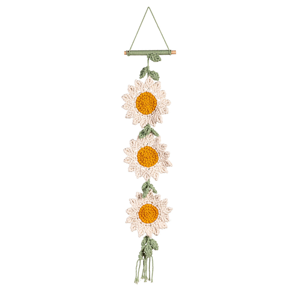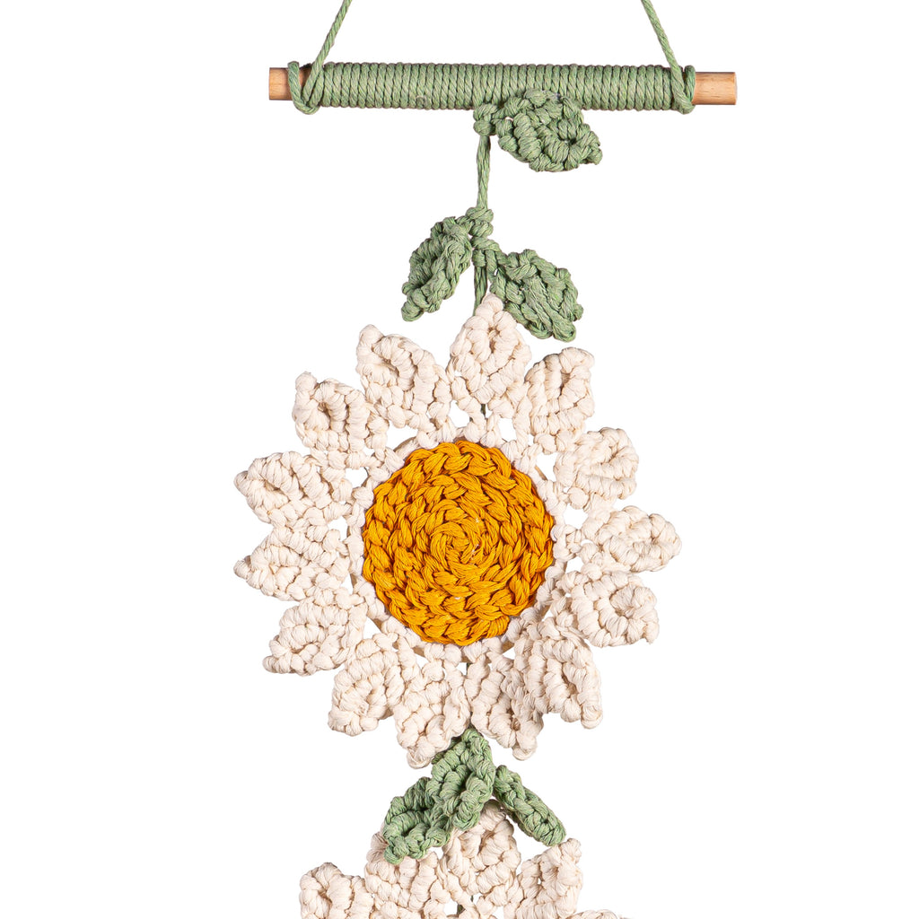 Enhance your space with the Daisy Macrame Hanging Decor, featuring intricate macrame craftsmanship that brings a natural touch to any room. This delightful piece showcases a charming daisy design with vibrant colors.