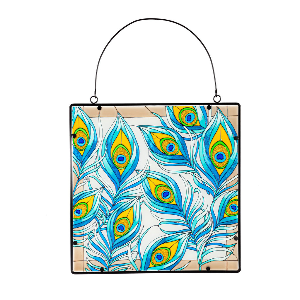 Elevate your home decor with this exquisite Peacock Stained Glass Wall Art, featuring vibrant peacock feather designs. Perfect for adding elegance to any indoor space.