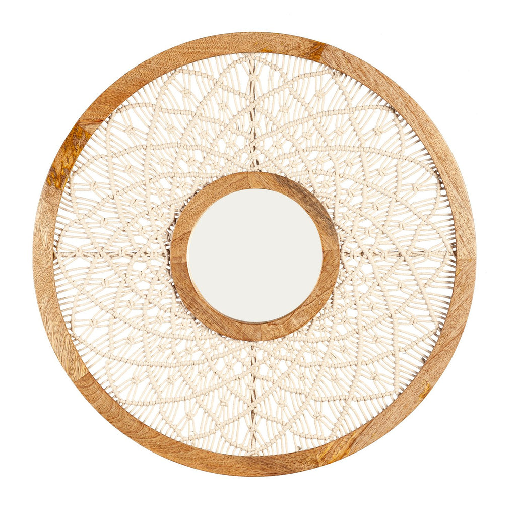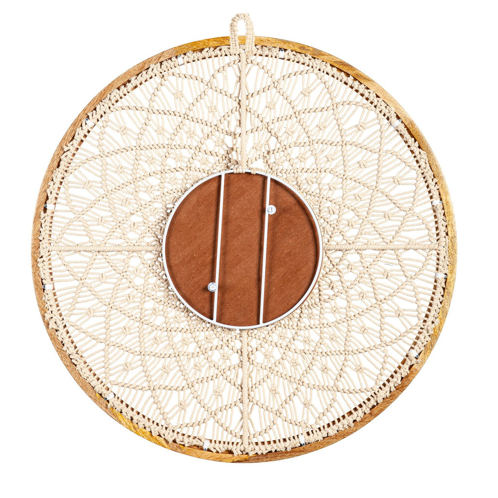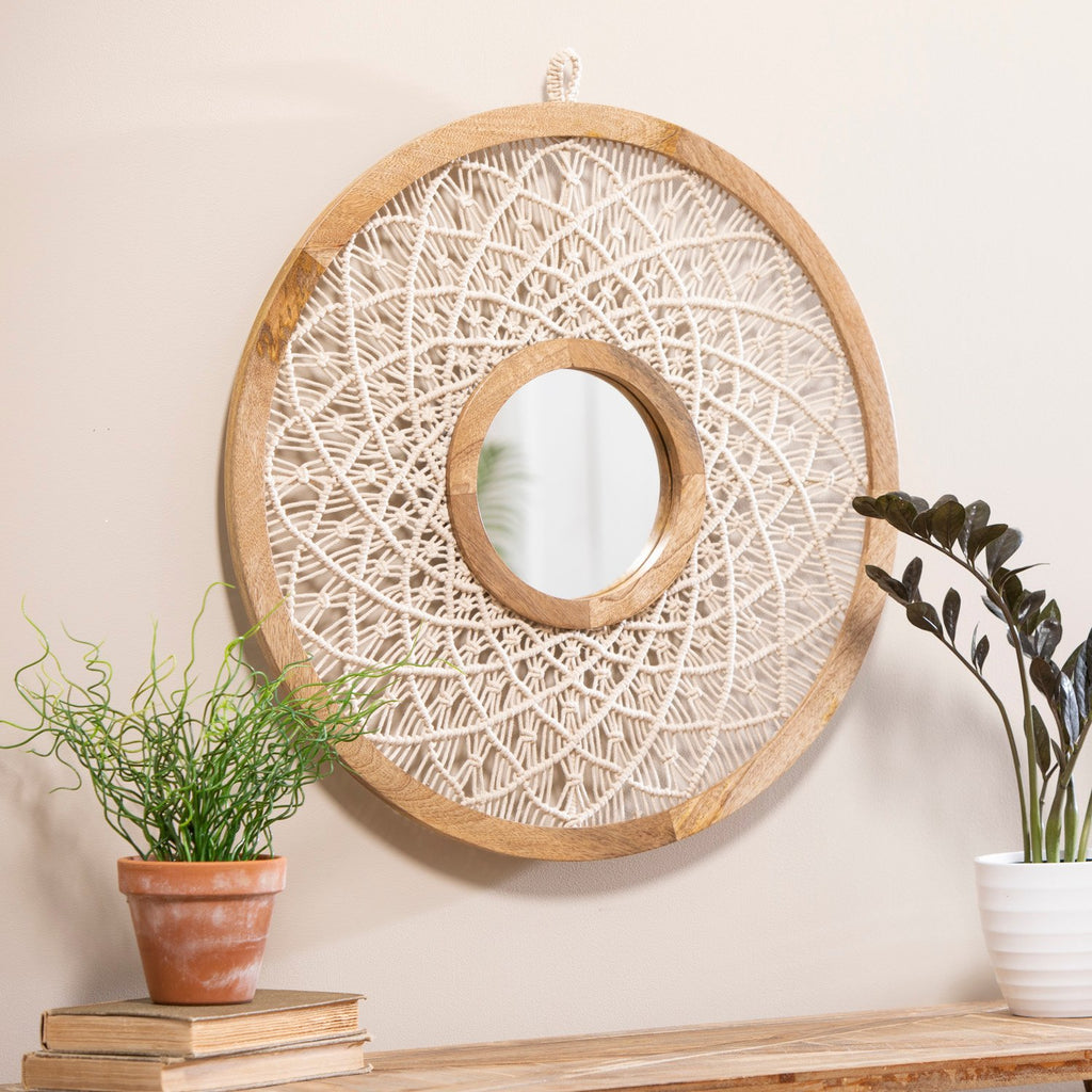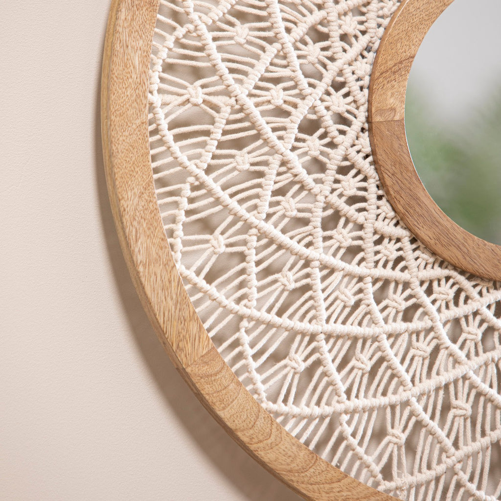 Add a touch of coastal elegance to any room with this Blue Coastal Indoor Wall Decor. Featuring a macrame circular design, this mirror brings a unique aesthetic to your wall space.