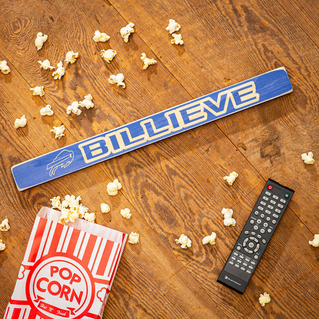Show your team spirit with the Buffalo Bills Engraved Wood Sign, perfect for any fan's home or office. Featuring the iconic team logo and 'BILLIEVE' message, this sign is a must-have decorative accent for loyal supporters.