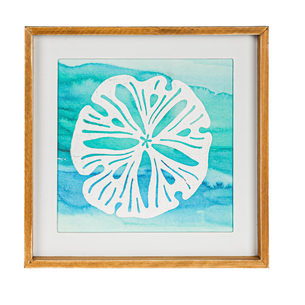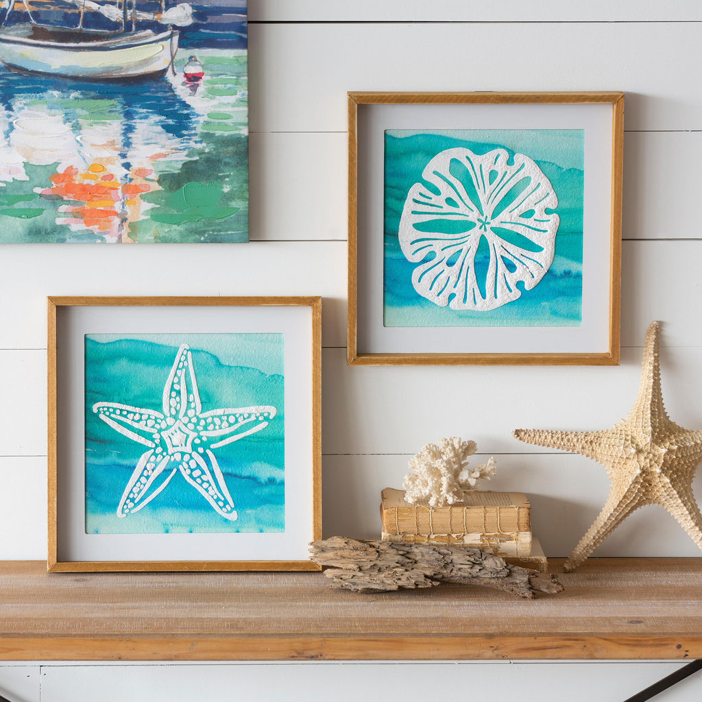Enhance your home with this charming set of two wall art pieces featuring intricate sand dollar and starfish designs in soothing blue and white tones. Perfect for adding a coastal touch to any room.