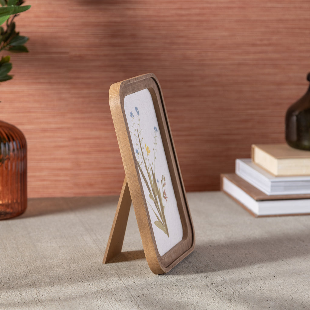Enhance your living space with this elegant Wood and Paper Pressed Flower Table Decor, featuring delicate pressed flowers encased in a wooden frame. Perfect for adding a touch of nature to any room.