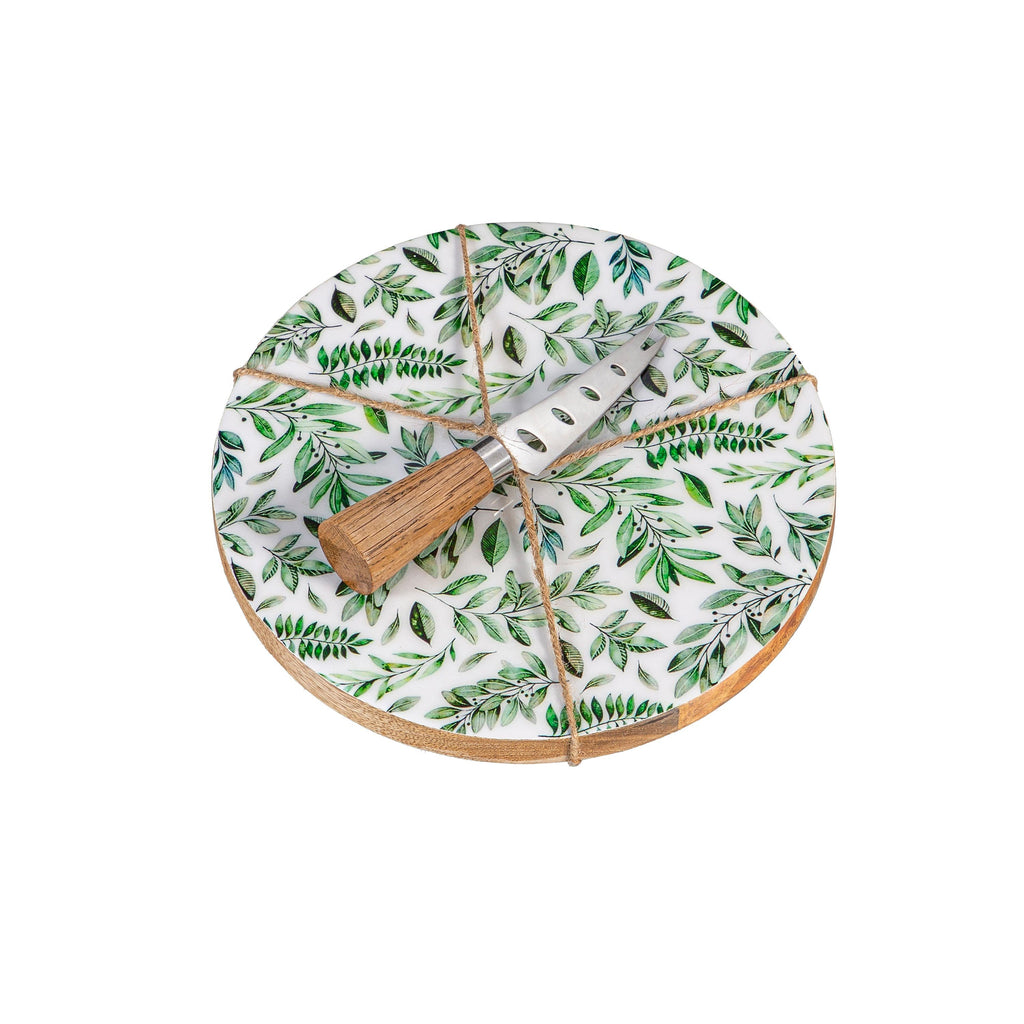 Elevate your entertaining with the Olive Oasis Wood Cheese Board with Knife Set, featuring a vibrant leaf pattern. Ideal for serving cheeses and appetizers stylishly.