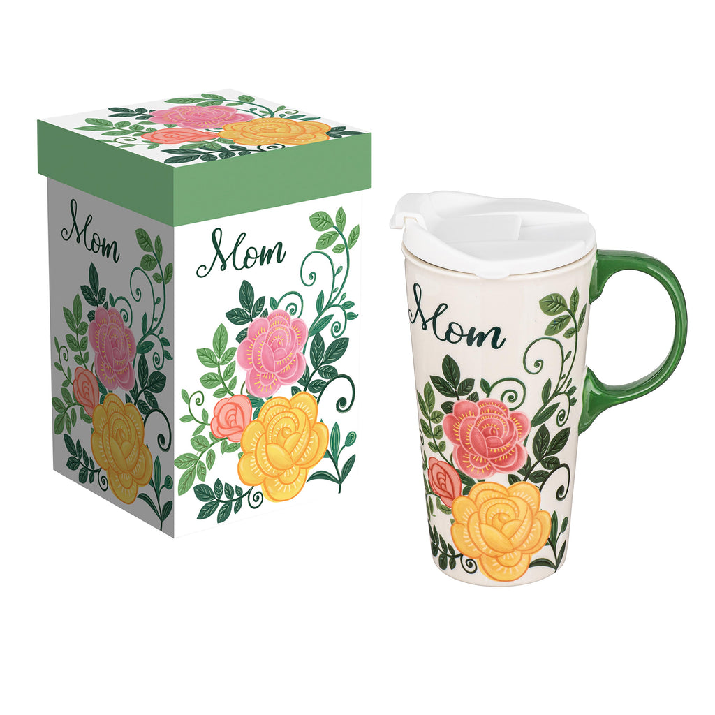 The Mom and Florals Ceramic Perfect Cup is a beautifully designed travel cup, featuring vibrant floral patterns and a heartfelt 'Mom' inscription. It comes in a matching gift box, making it an ideal present for any occasion.
