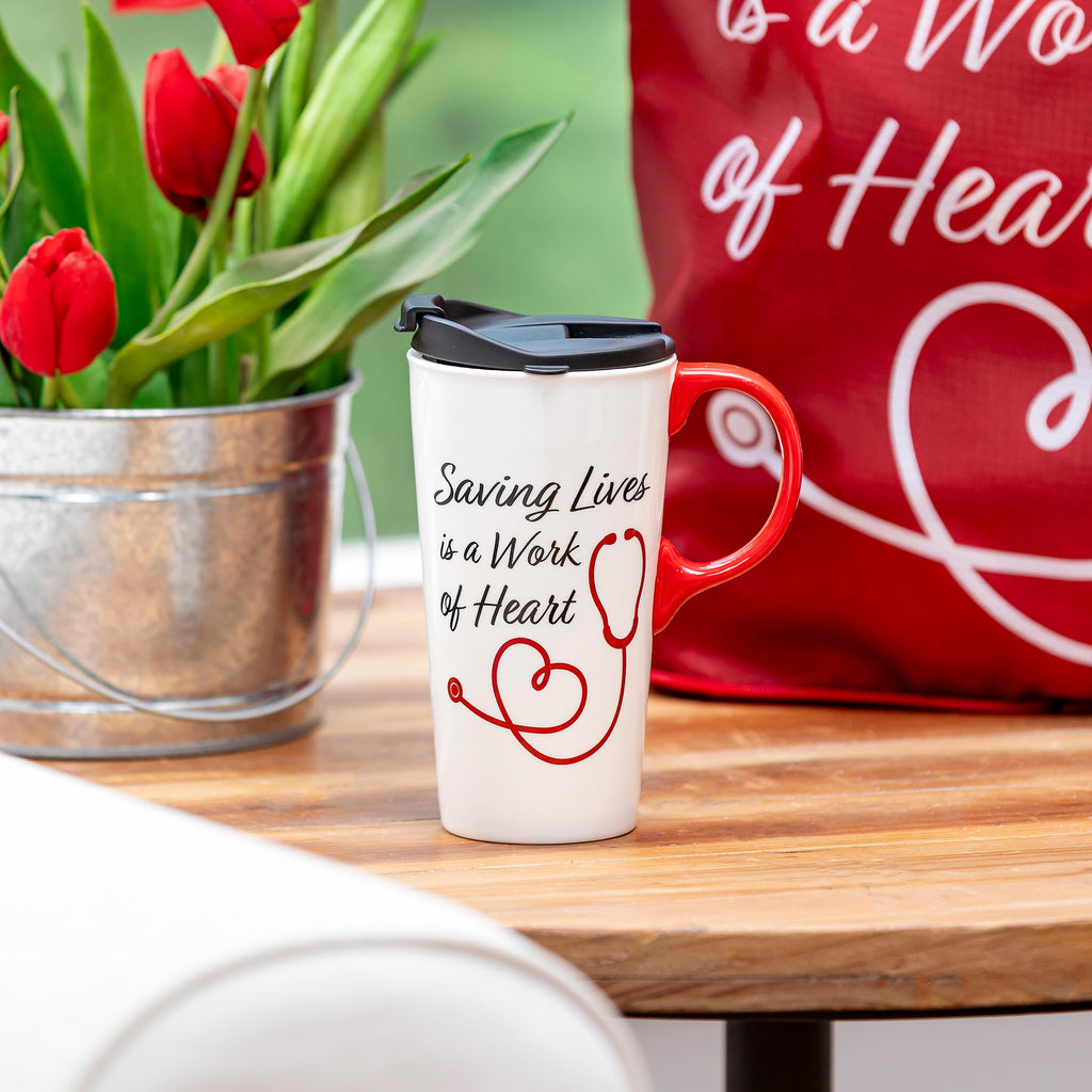 This gift set includes a ceramic cup and a compact tote, both featuring an inspiring 'Saving Lives is a Work of Heart' design. Perfect for healthcare professionals, it combines practicality with heartfelt appreciation.