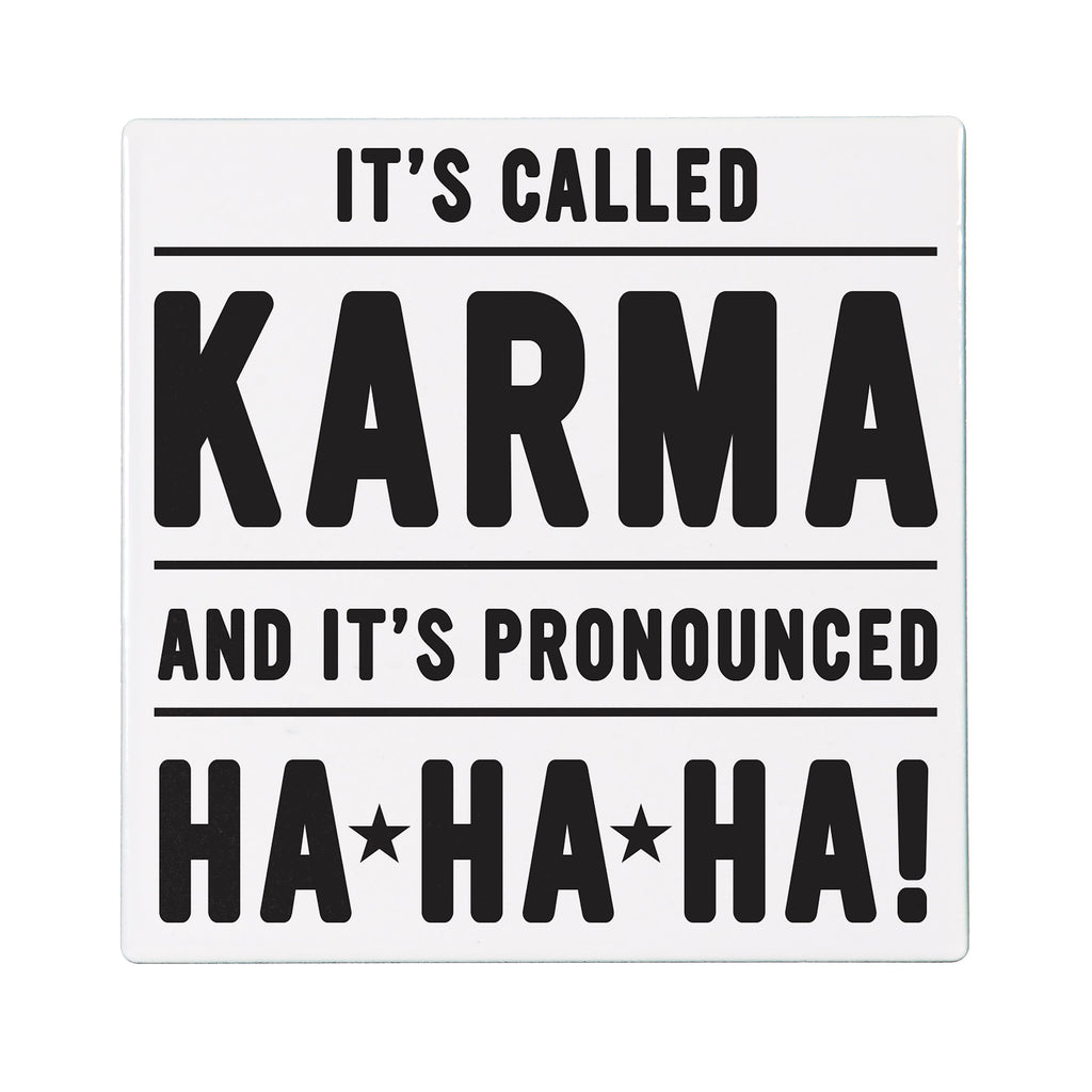 Keep surfaces safe with this witty stone coaster featuring a humorous quote about karma. Its durable design is perfect for everyday use in any home setting.