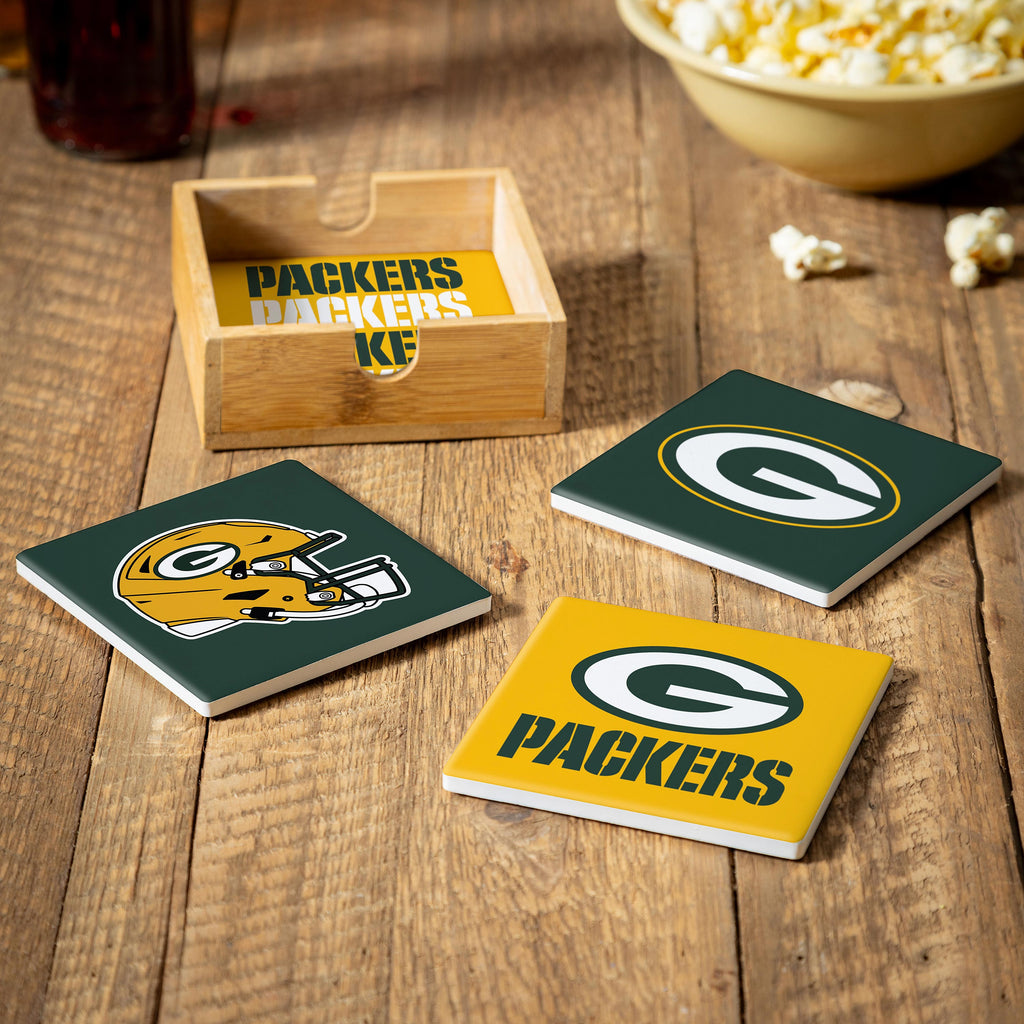 - Includes four ceramic coasters featuring the Green Bay Packers logo.