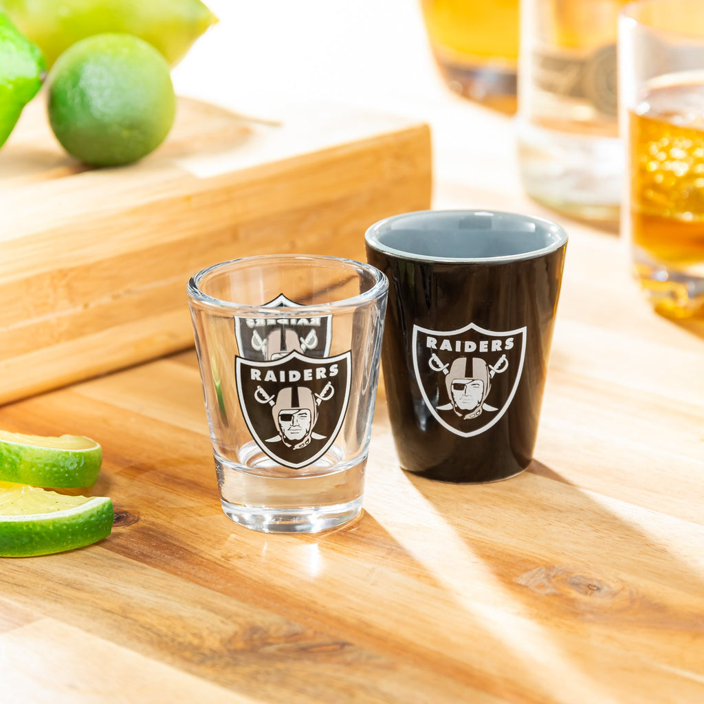 Celebrate your favorite team with this Las Vegas Raiders 4-Piece Ceramic and Glass 2oz. Cup Set, perfect for game day or any occasion.