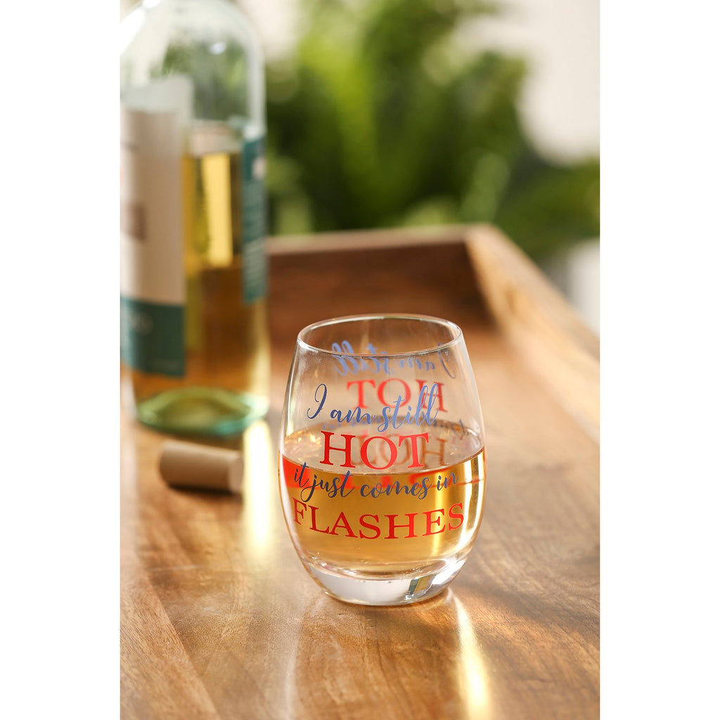 This stemless wine glass features a playful design with the text 'I am still hot it just comes in flashes,' making it a fun addition to any drinkware collection. Packaged in a vibrant, patterned box, it makes for a charming gift.