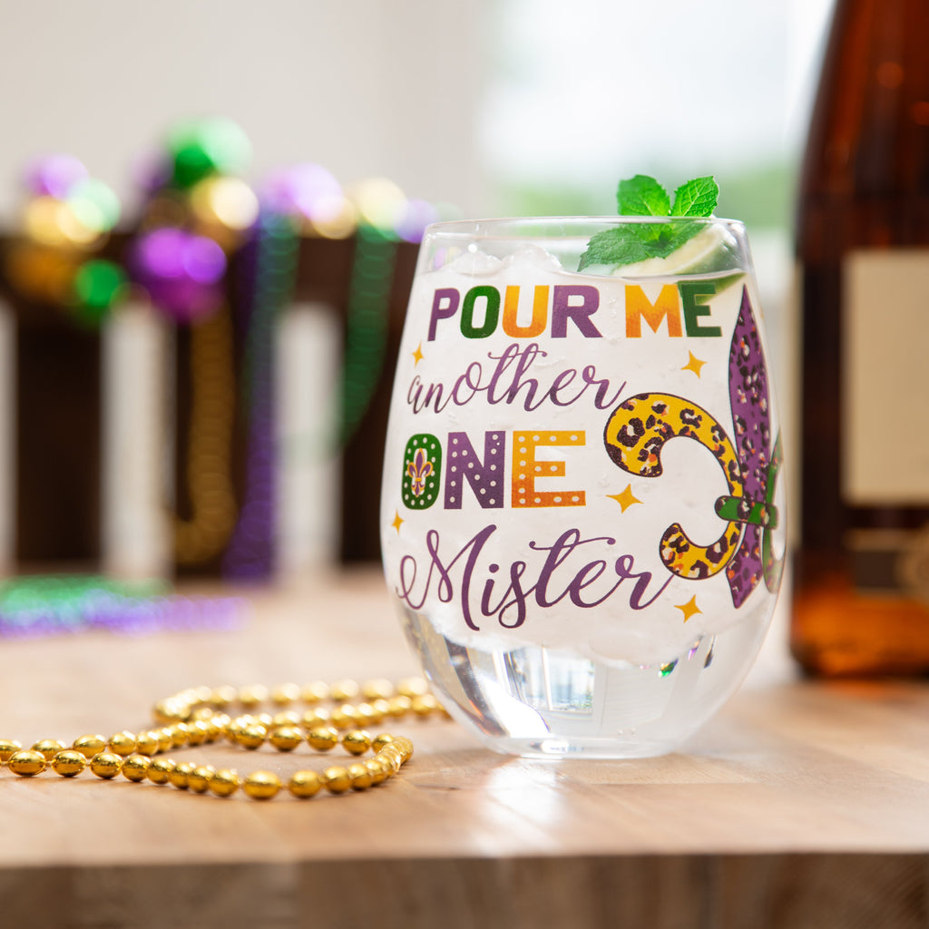 Celebrate Mardi Gras in style with this vibrant Fleur De Lis stemless glass. Perfect for serving your favorite wine, this 17oz glass makes a festive addition to any gathering.