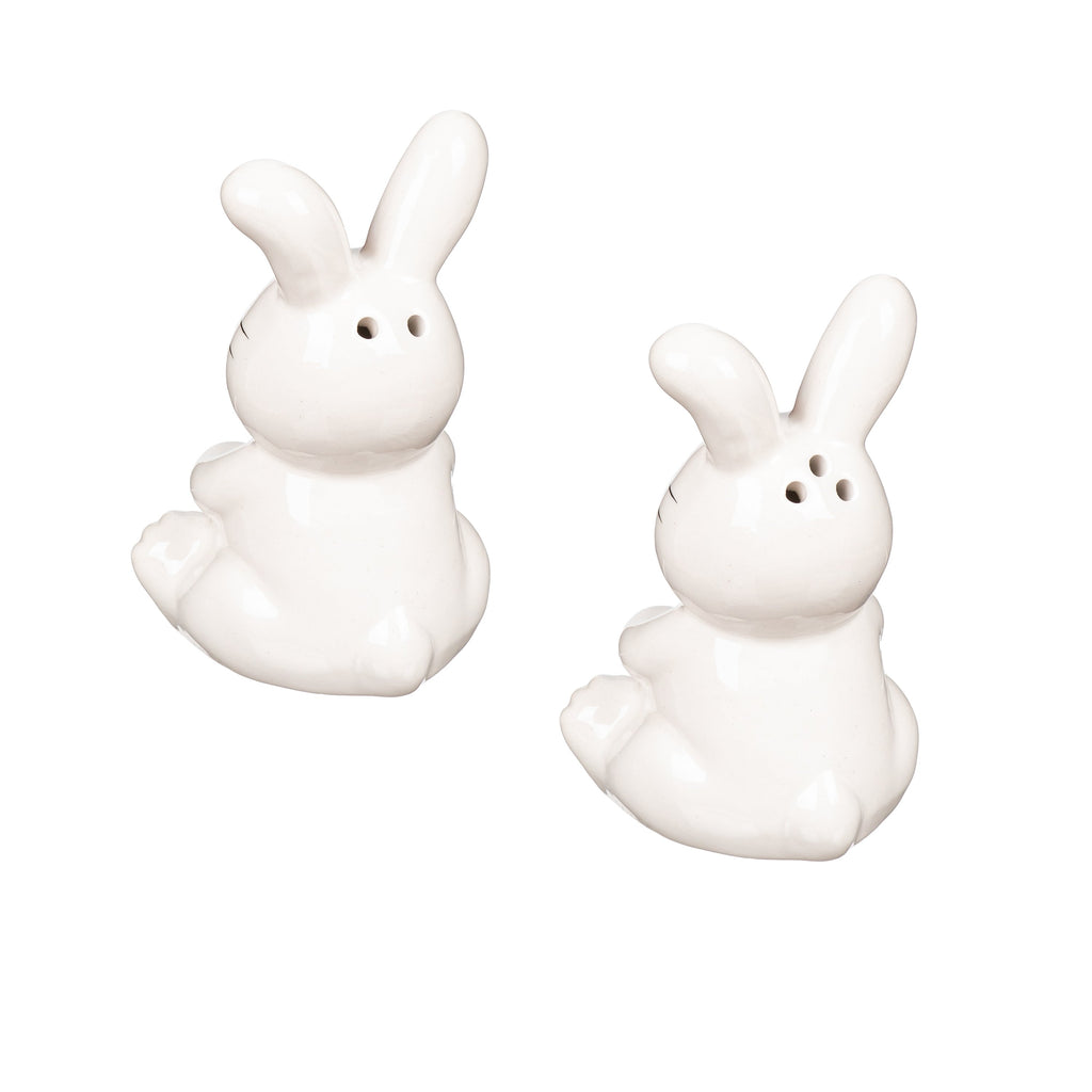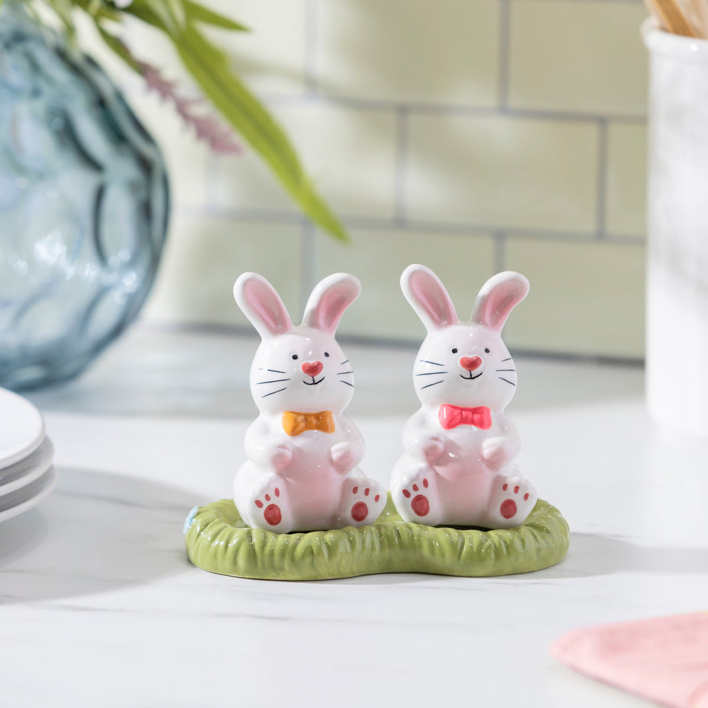 Celebrate Easter with this adorable ceramic salt and pepper set featuring bunnies seated on a floral base. Perfect for adding a festive touch to your dining table.