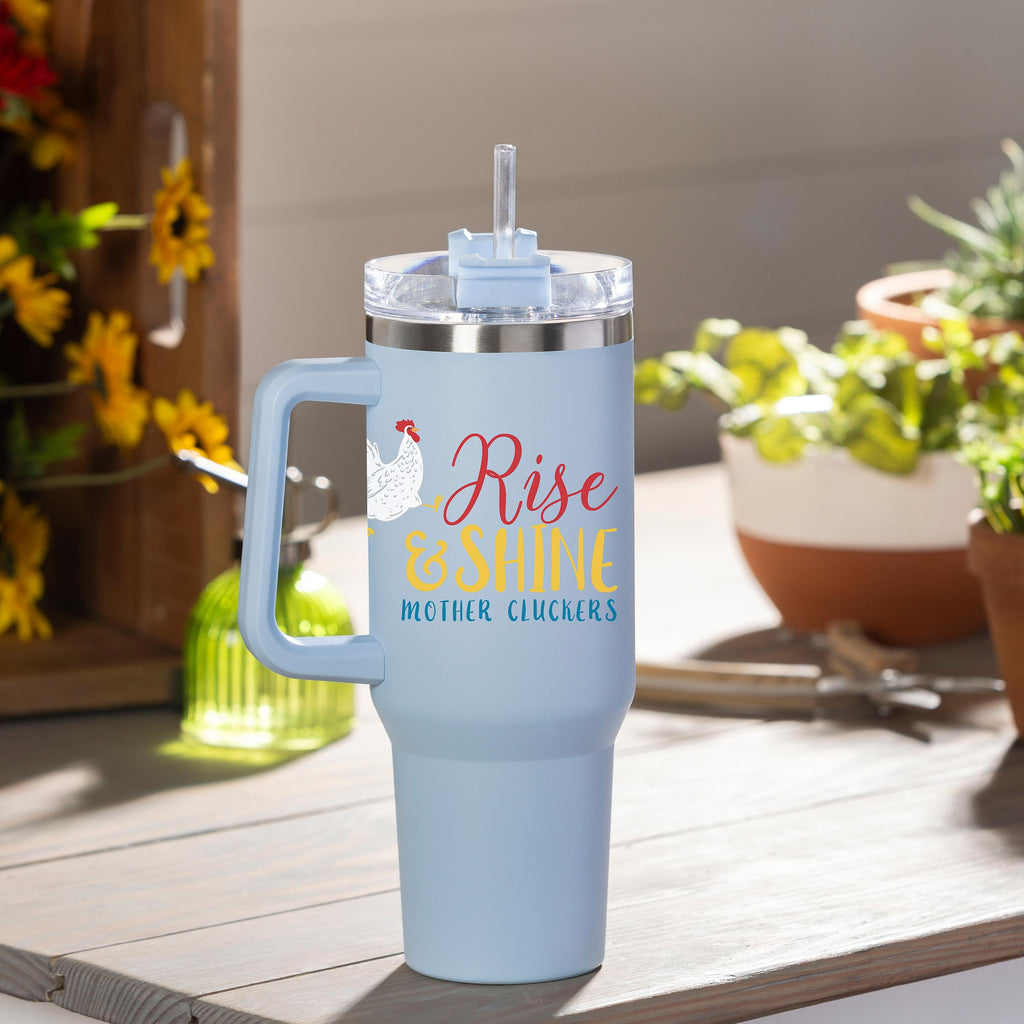 Enjoy your favorite beverages on the go with the Rise & Shine Chicken Canyon Cup. This 40oz double wall stainless steel cup comes with a straw and features a playful chicken design.