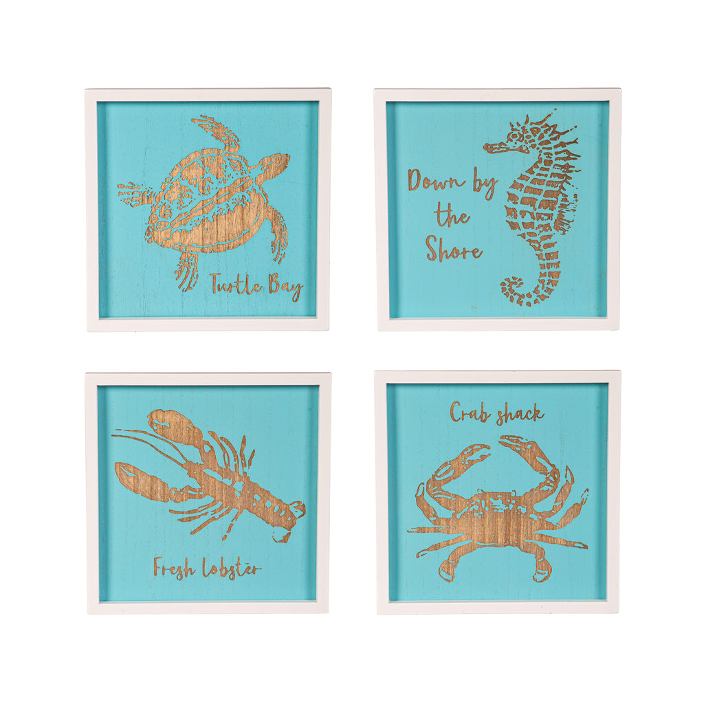 Bring the serenity of the sea into your home with this charming Sea Animals Wall Décor set. Featuring beautifully crafted designs of a lobster, crab, turtle, and seahorse, these pieces add a coastal touch to any room. Each artwork is set against a calming aqua backdrop and framed in white, perfectly complementing beach-inspired or nautical themes. Measuring 12 inches in height, these decorations are ideal for living rooms, bathrooms, or any space needing a splash of oceanic whimsy. Elevate your interior with this delightful set, perfect for sea lovers and coastal enthusiasts alike.