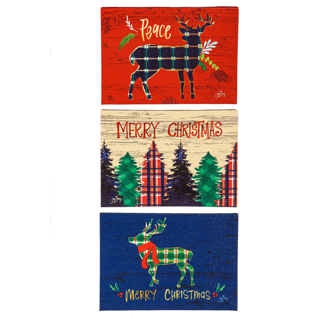 Illuminate your home with the festive charm of the Mini LED Canvas featuring a plaid deer and trees design. Measuring 8 inches high and 6 inches long, this indoor wall décor piece combines rustic holiday motifs with vibrant LED lights, creating a warm and inviting atmosphere. The plaid patterns and seasonal greetings add a touch of traditional Christmas spirit, while the LED lights gently highlight the artwork. This canvas is perfect for adding a cozy and cheerful accent to any room during the holiday season.