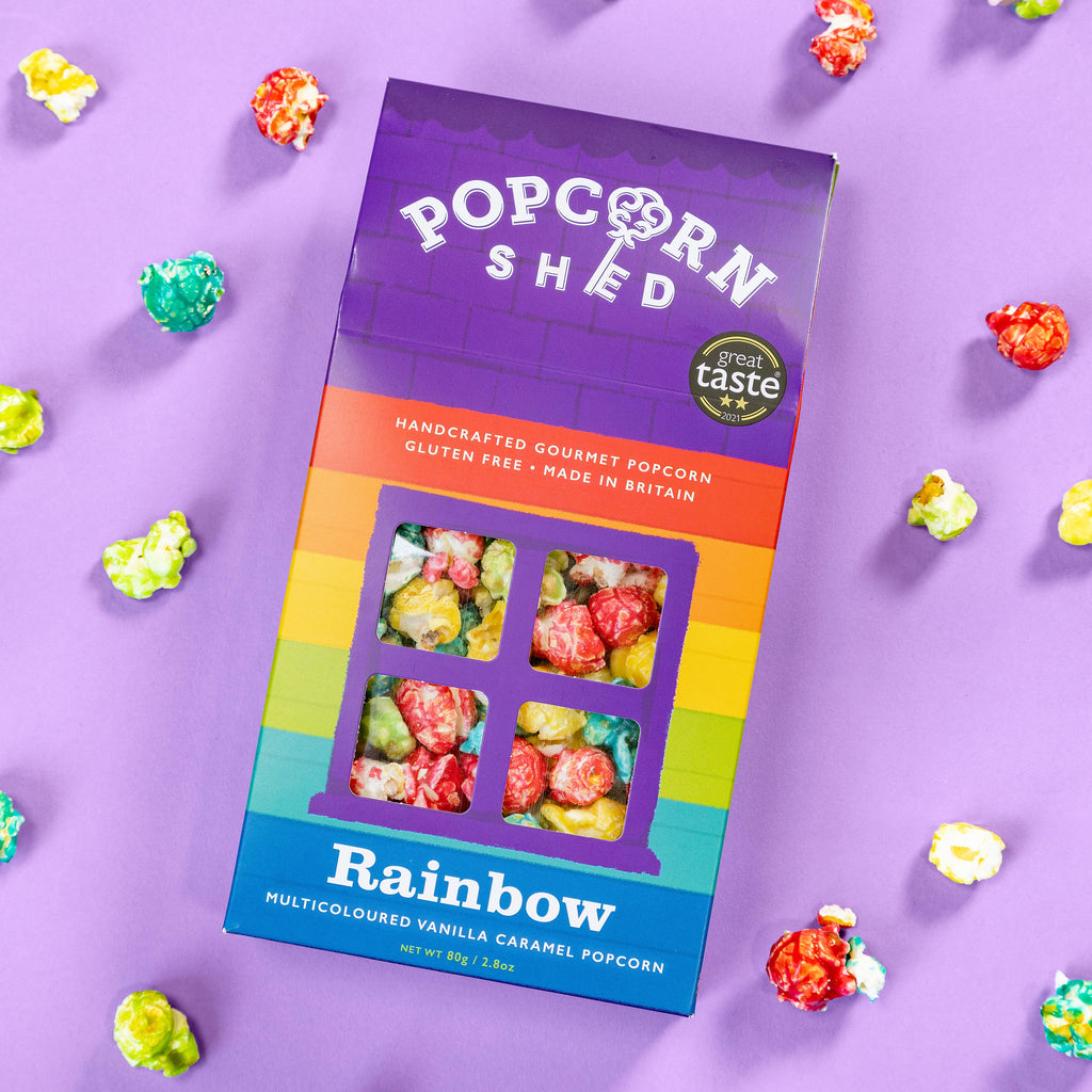 - Handcrafted gourmet popcorn with a unique rainbow color.