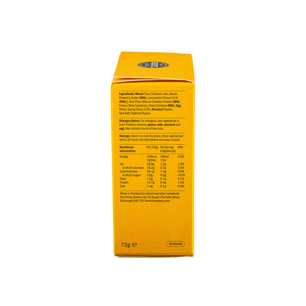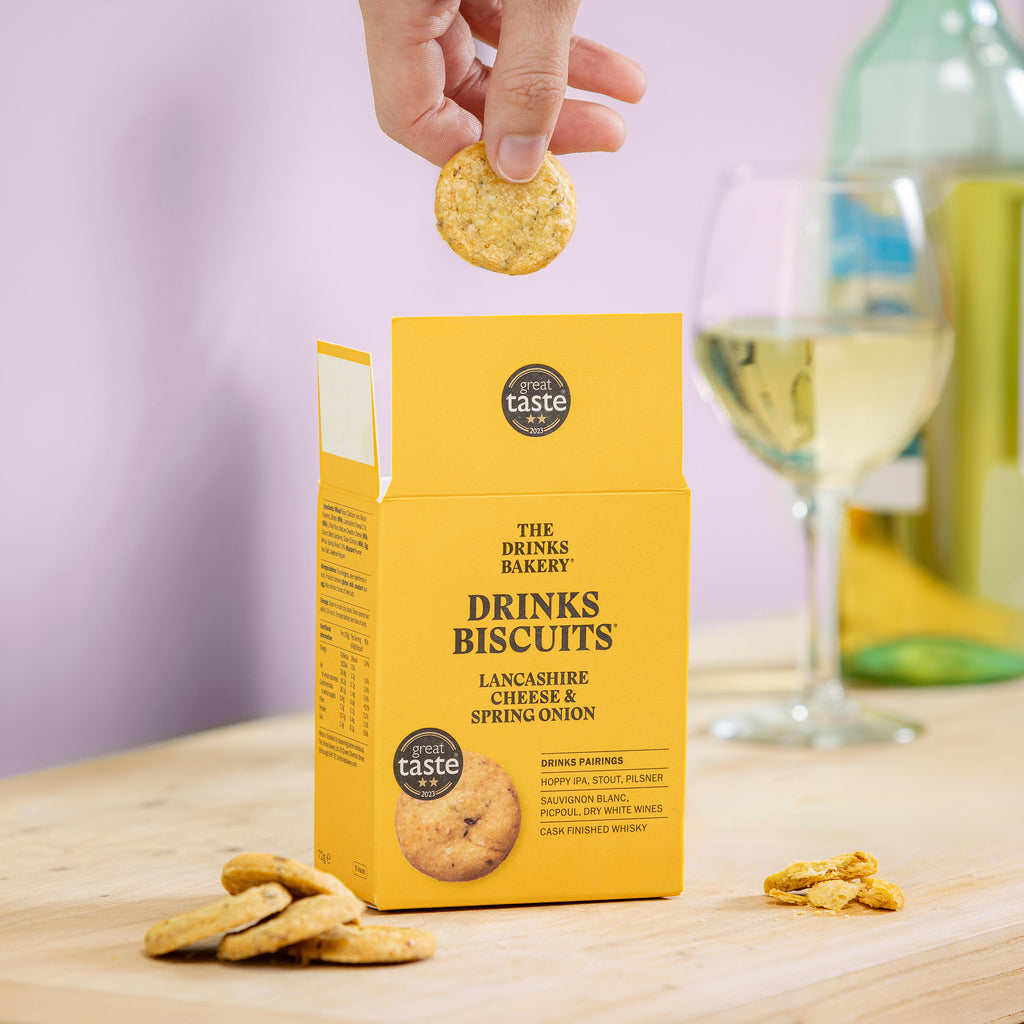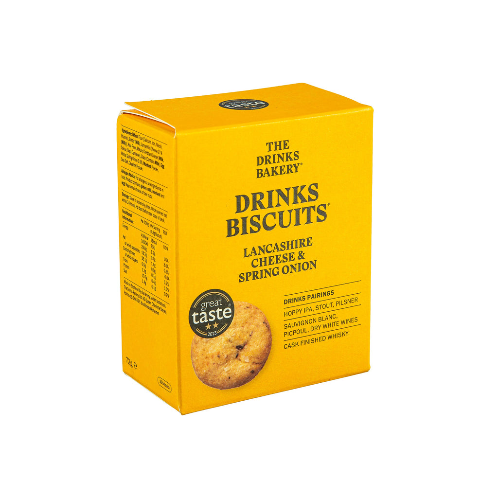Indulge in the savory delight of The Drinks Bakery Lancashire Cheese and Spring Onion biscuits, expertly crafted for pairing with your favorite drinks.
