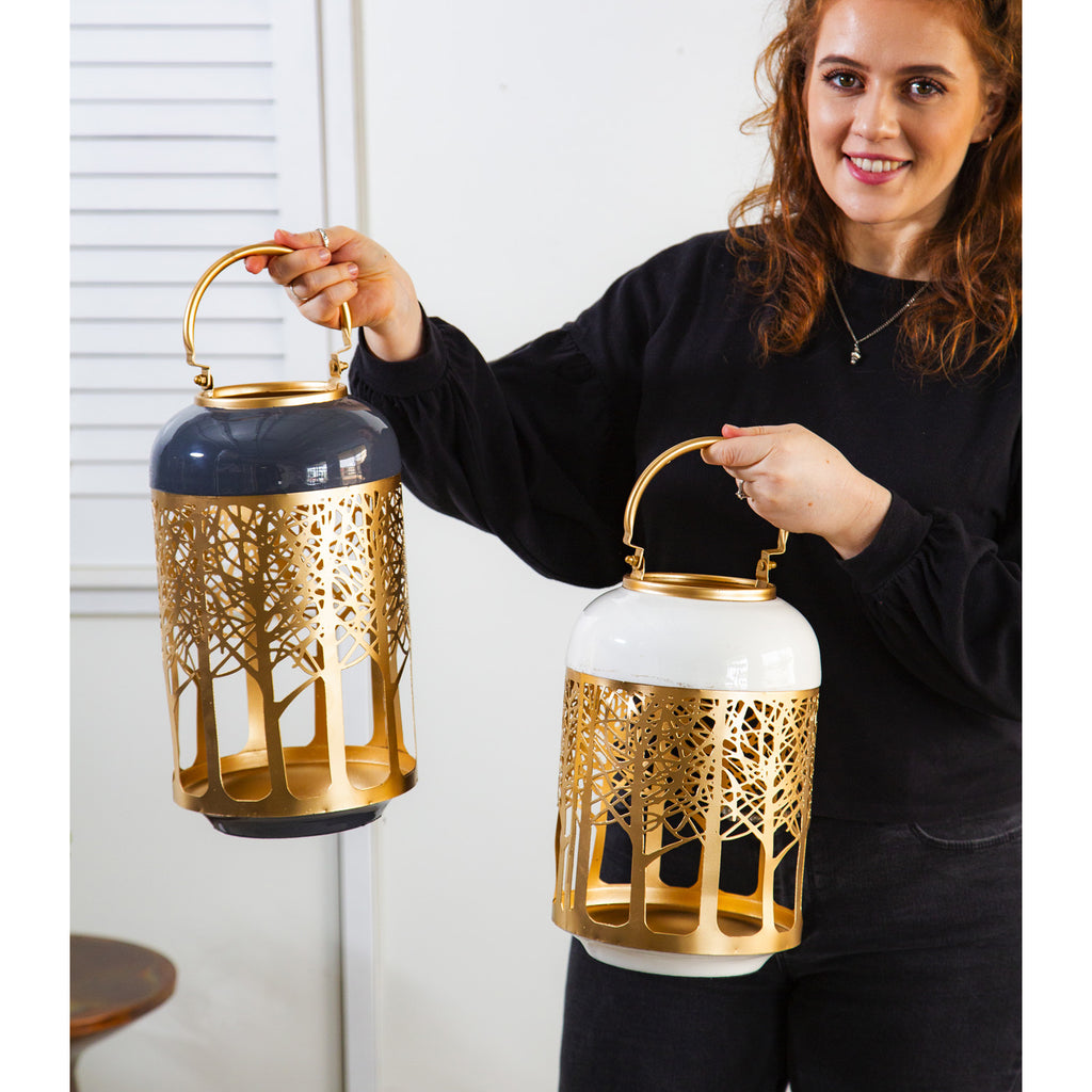 Enhance your home decor with this elegant set of two lasercut metal lanterns, featuring intricate designs and a sleek finish. Perfect for adding a warm glow to any space.