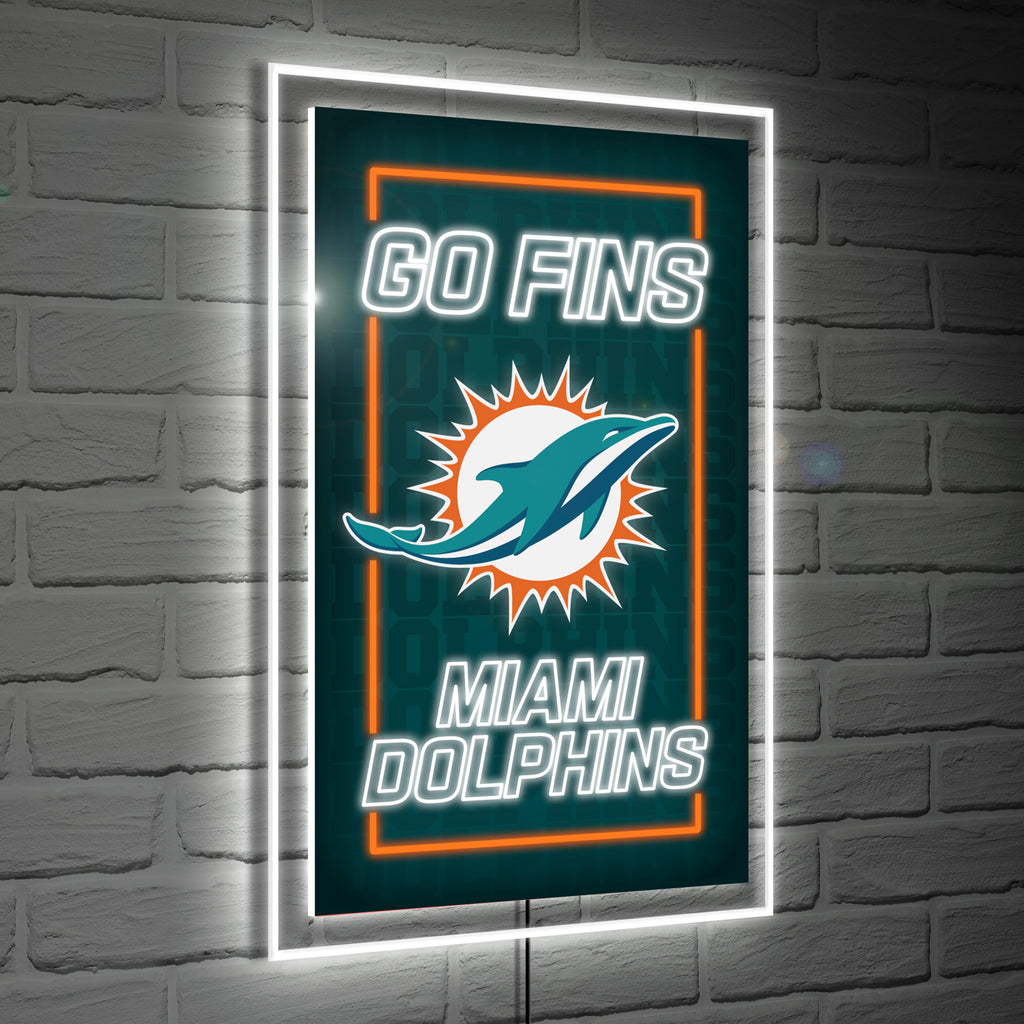 Illuminate your space with the vibrant Miami Dolphins Neolite LED Wall Décor, perfect for any true fan. Measuring 22 inches by 14 inches, this sleek, rectangular sign features the iconic team logo and colors, enhanced by bright LED lighting to make a bold statement. Its slim 0.25-inch profile allows for easy installation in any room, whether it's your game room, bedroom, or office. Show your team pride with a modern twist, making it an ideal gift for any Dolphins supporter.