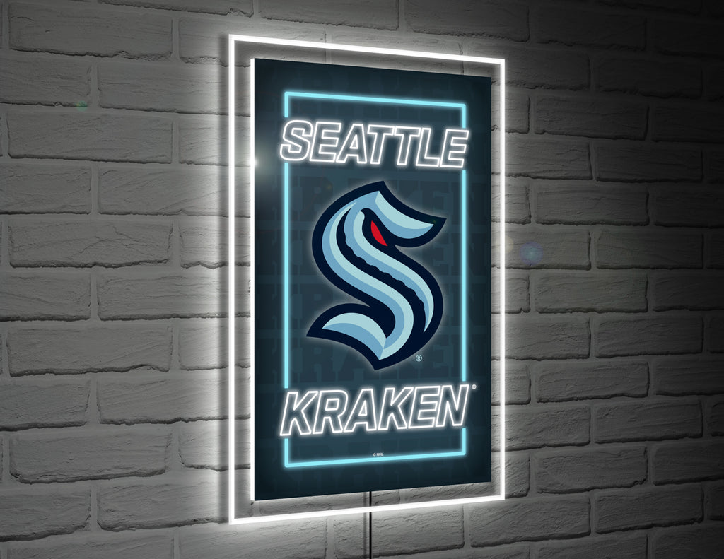 Illuminate your space with the vibrant Seattle Kraken Hockey Rectangle Neolite LED Decor. Perfect for any hockey fan, this eye-catching wall piece measures 22 inches by 14 inches, making it a bold addition to your home, office, or game room. The sleek design features the iconic Kraken logo and colors, enhanced by LED lighting to create a captivating glow. With its slim 0.25-inch profile, it's designed for easy wall mounting, bringing a touch of team spirit to any setting.