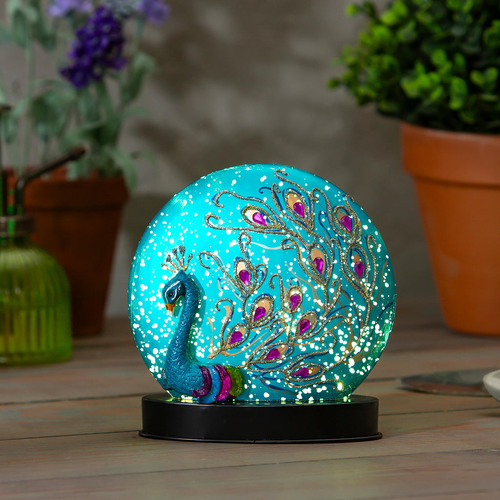 Enhance your home's ambiance with the Peacock LED Glass Table Decor, a stunning piece featuring vibrant colors and intricate details that illuminate your space beautifully.