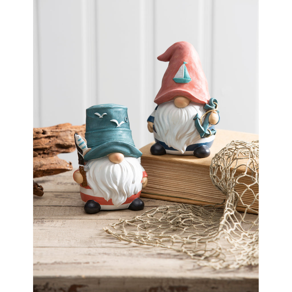 Add a touch of nautical charm to your home with these delightful gnome table decors, featuring one holding an anchor and the other a fishing pole.