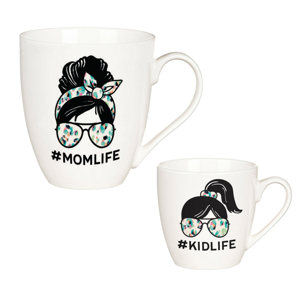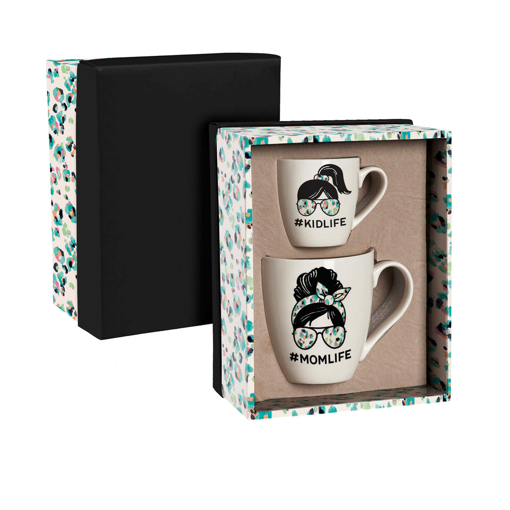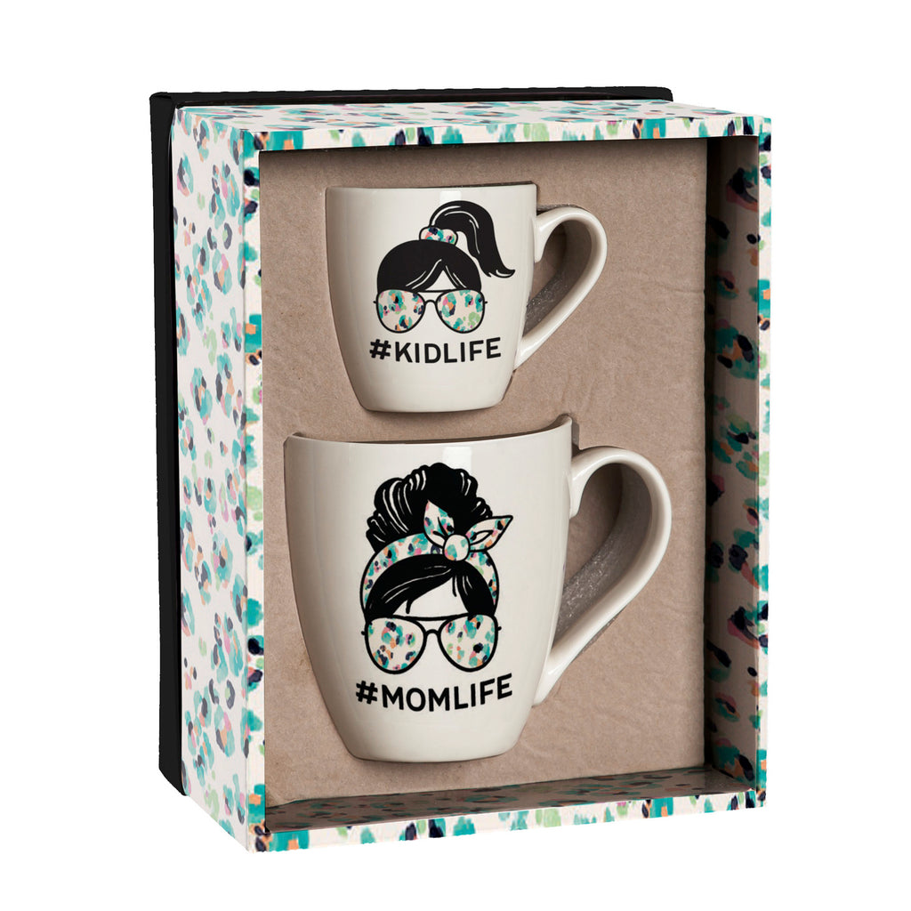 This charming Mommy and Me Ceramic Cup Gift Set features two playful cups, perfect for enjoying beverages together. Each cup is adorned with a #MOMLIFE or #KIDLIFE design, adding a fun and personal touch.